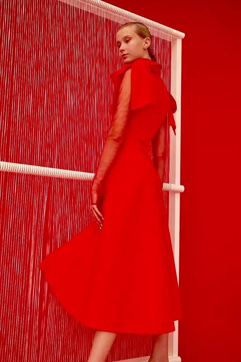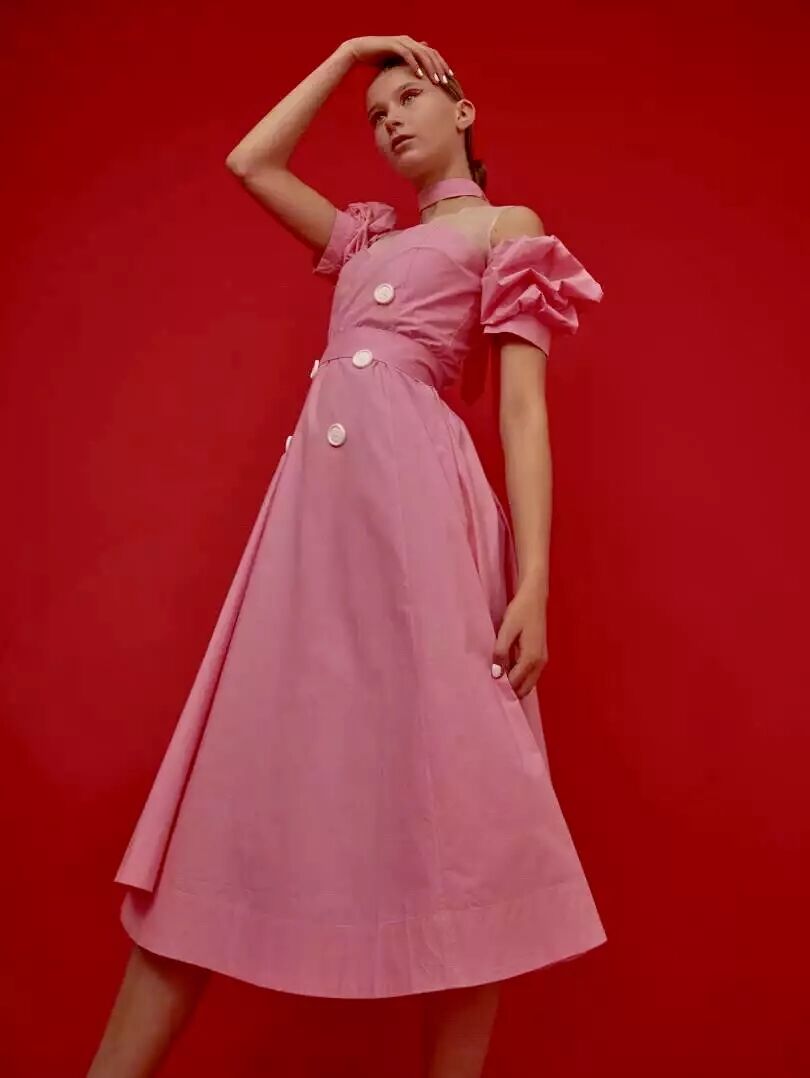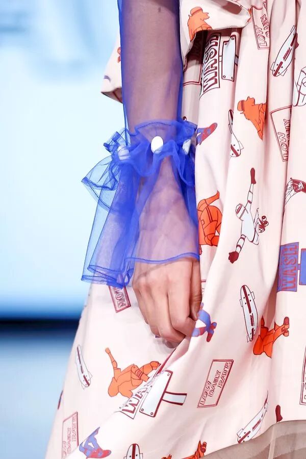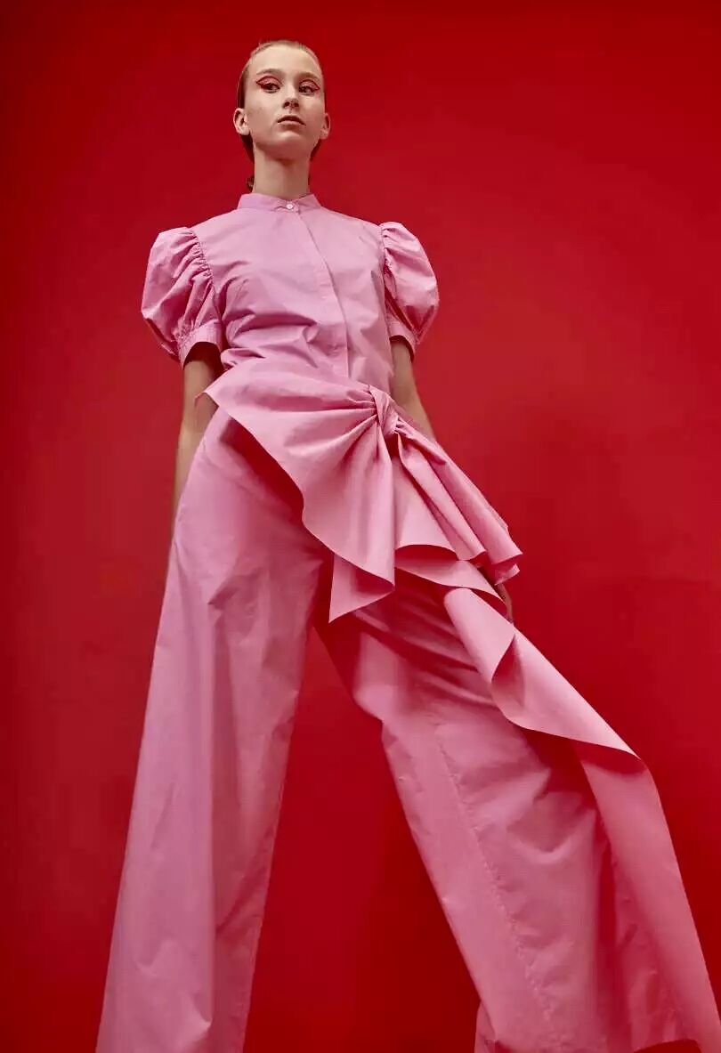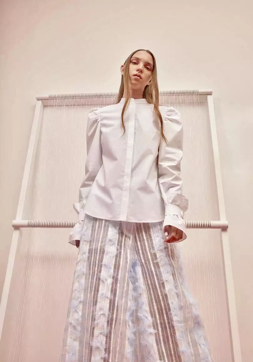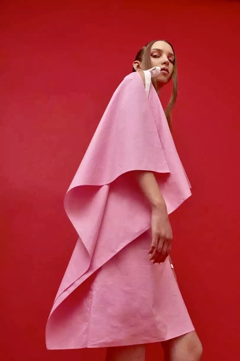 2018 早春系列以“ 自我寻找 / 实现 ”为主题,细腻的褶皱配合简洁的大廓形,不规则结构配合甜美的大号娃娃领,超现代主义的“二次元”印花图案,形成一种玩味的 冲撞。 “一半可爱,一半强势”。两面都美,都欢喜。