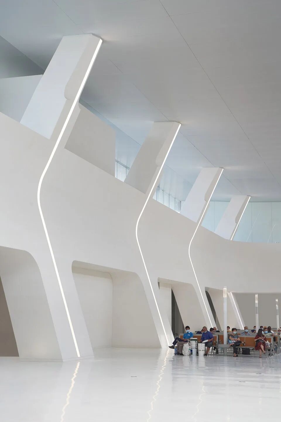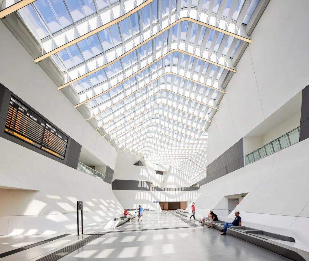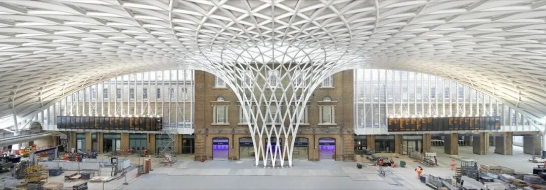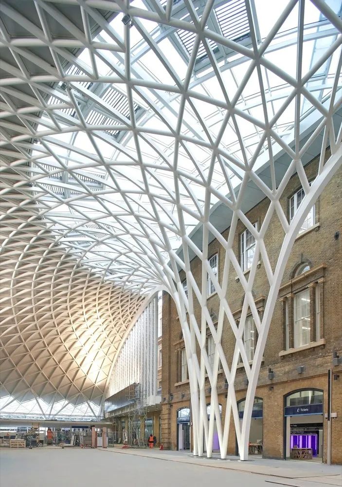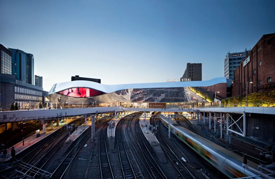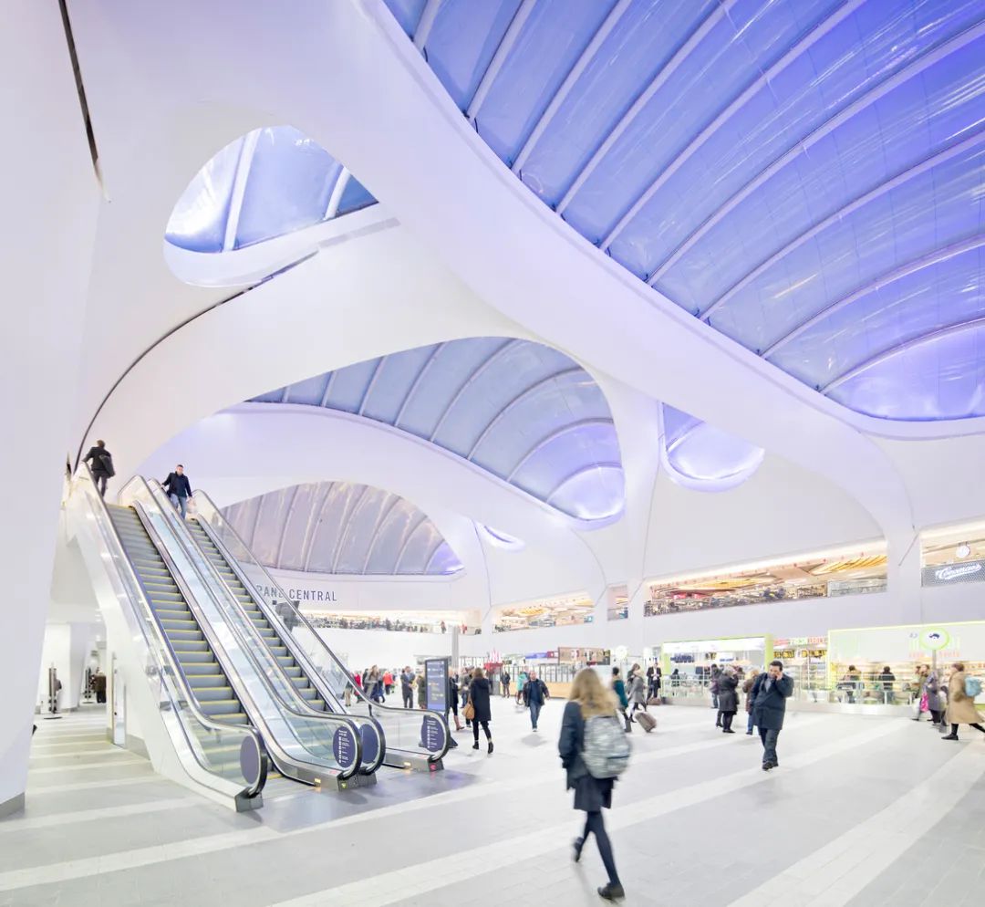 伯明翰新街道车站以一种动态扭曲的几何形态。分支的波浪状柔和形态装点了城市,传递出了交通中心的特征,其中可以感受到不同的交通,就像运河、道路之间的互相叠加一样。