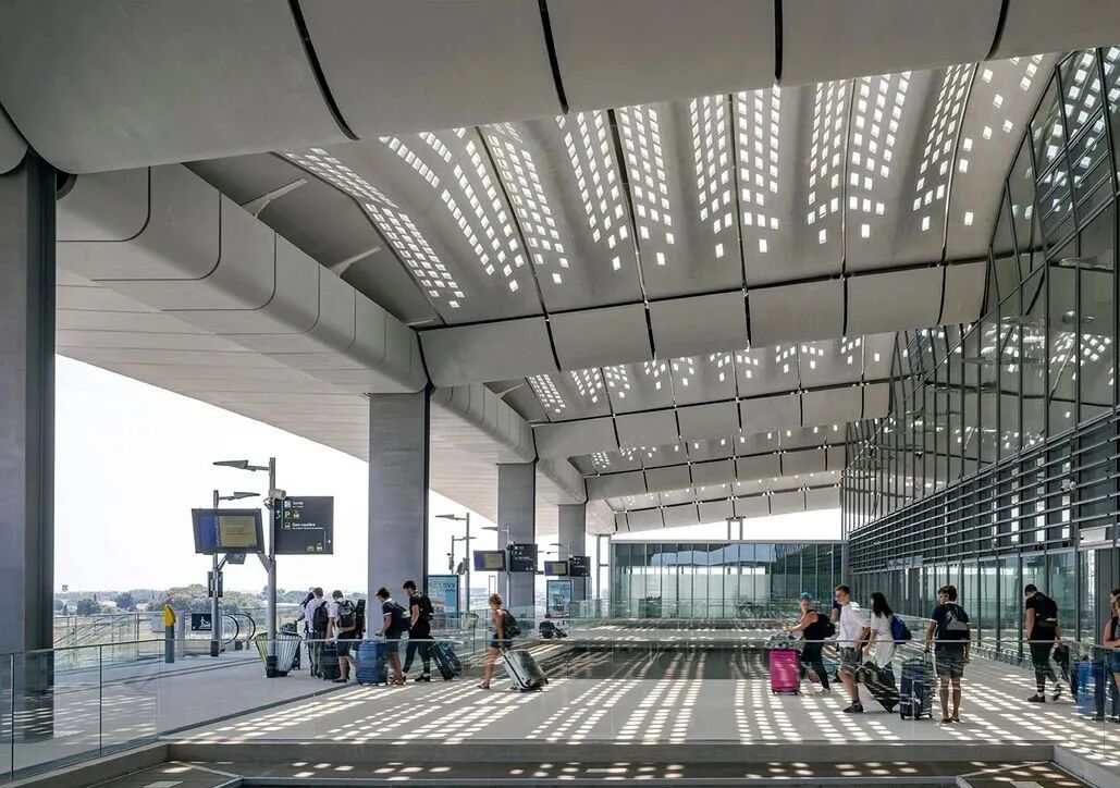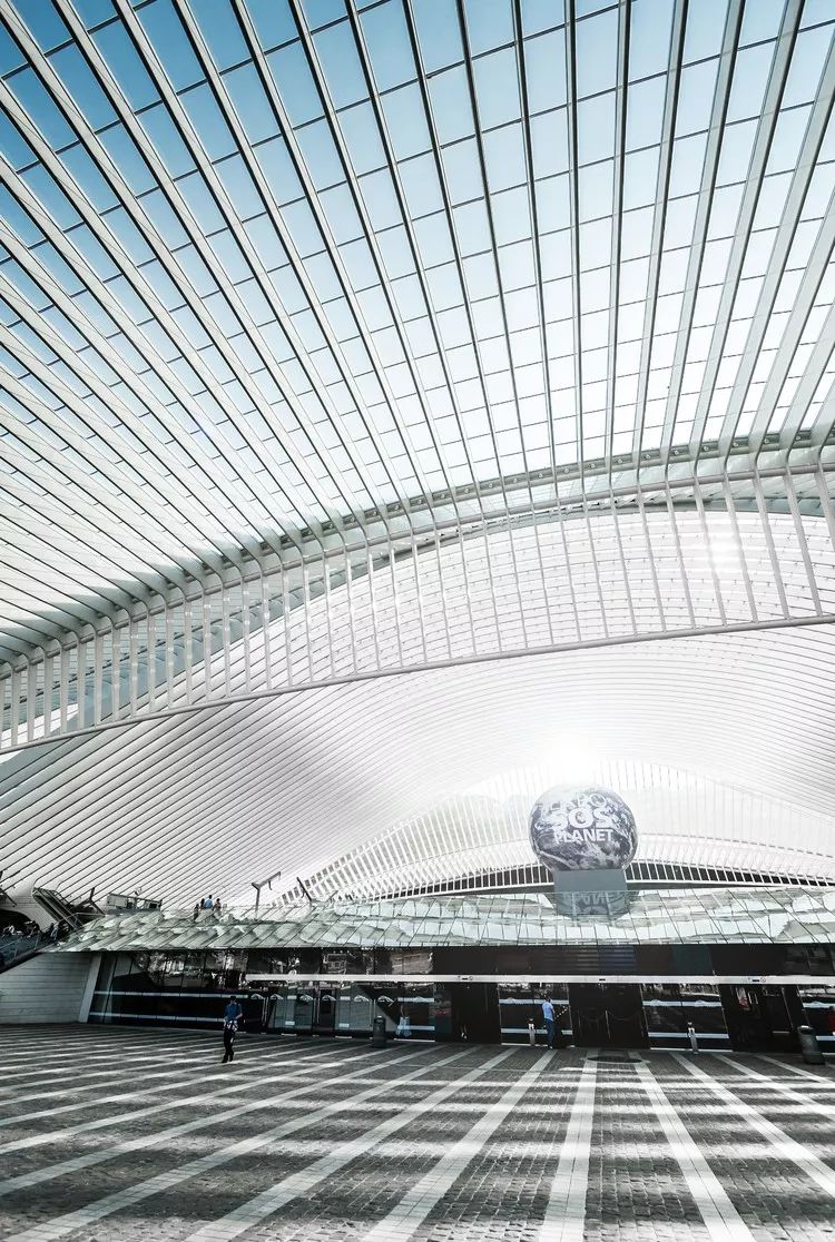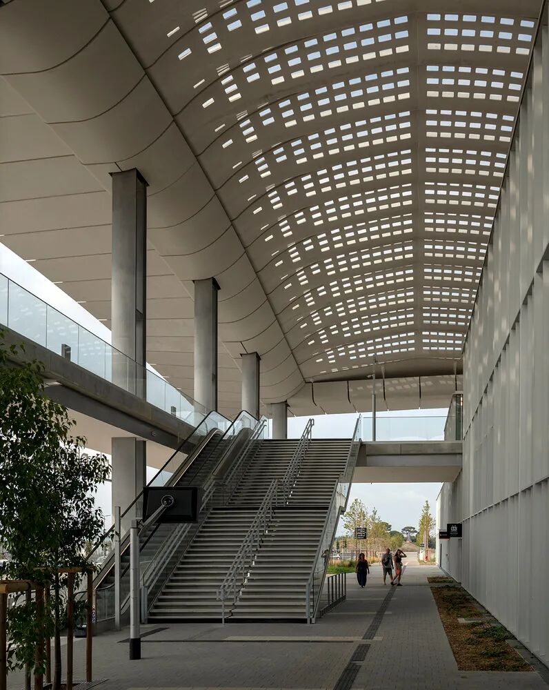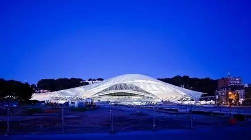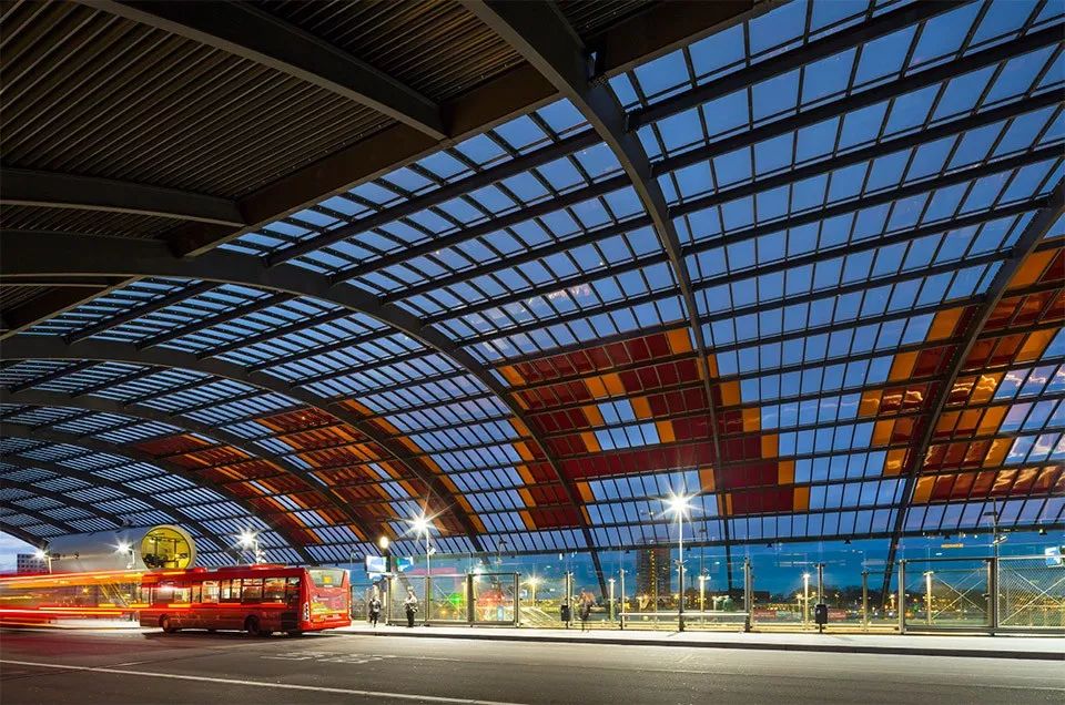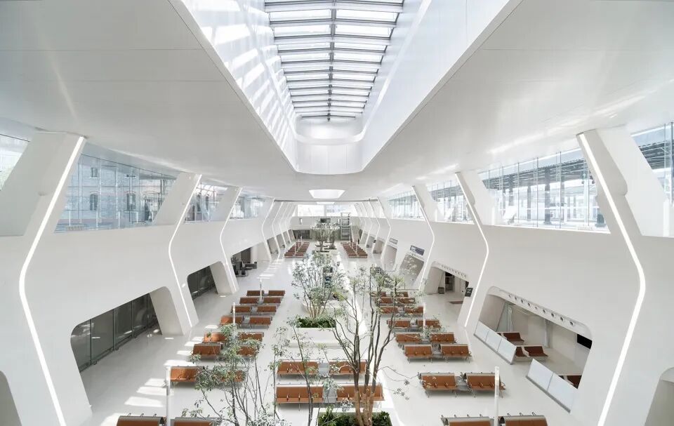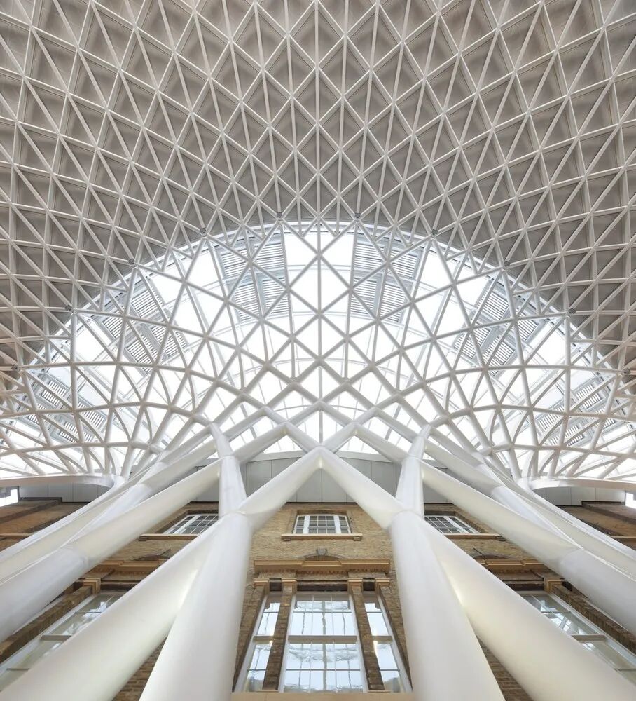 伯明翰新街道车站以一种动态扭曲的几何形态。分支的波浪状柔和形态装点了城市,传递出了交通中心的特征,其中可以感受到不同的交通,就像运河、道路之间的互相叠加一样。