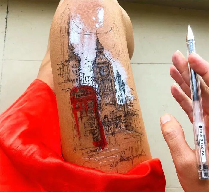 接下来,我们就一起欣赏一下这位不靠颜值靠才华的美女艺术家,在腿上创作的精彩画作吧。