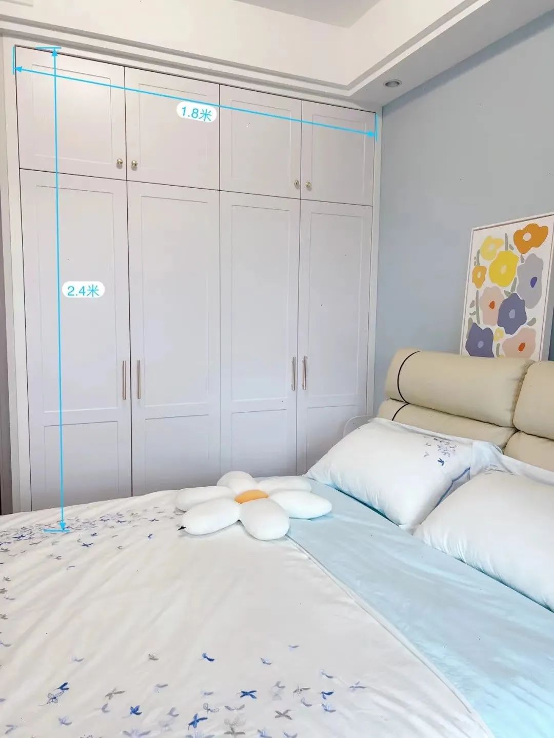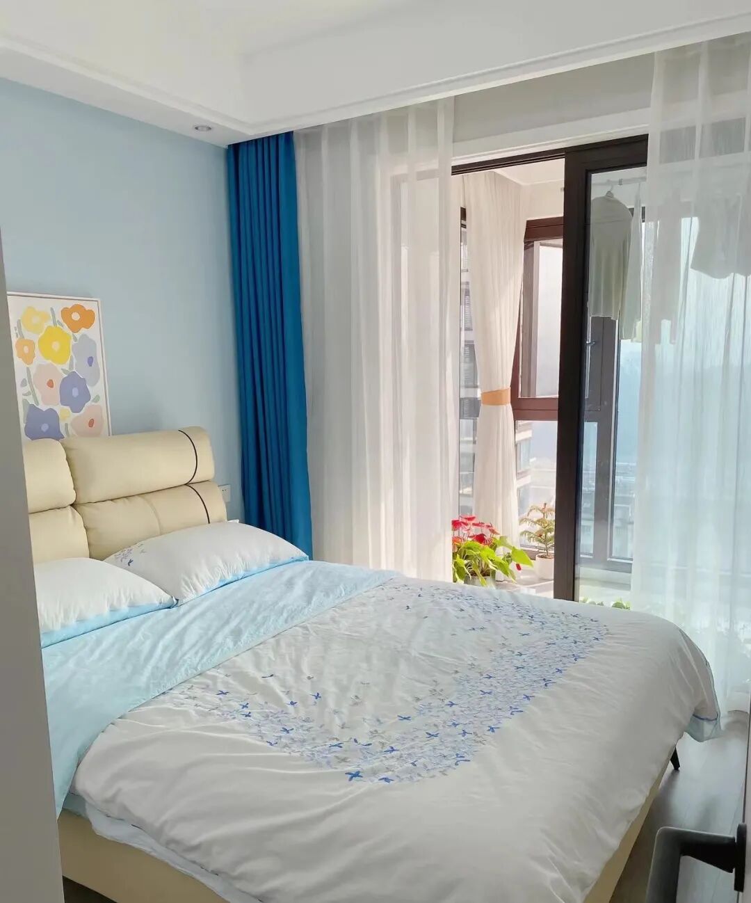 次卧只有9平米,只放了一张床,定制了一个衣柜,满足基本的生活需要,衣柜以白色搭配金色拉手,简约又时尚,床头背景墙刷了淡蓝色的乳胶漆,床品也是蓝色系,充满了小清新的气息,次卧还带了一个阳台,主要用来晾晒衣服。