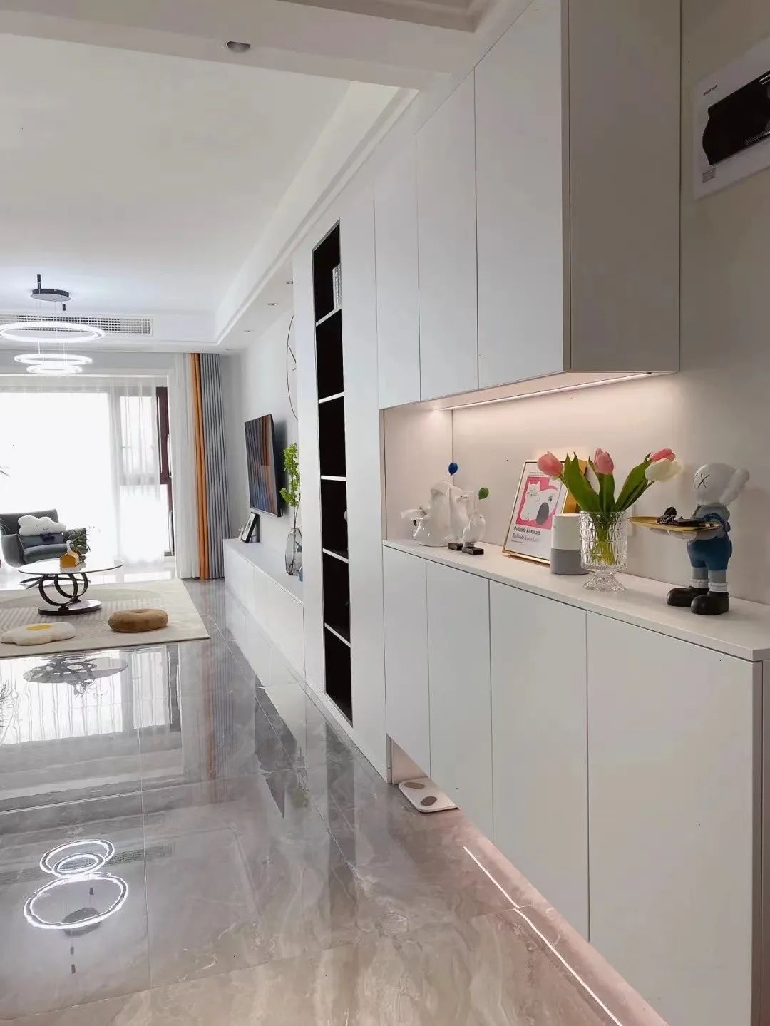 站在客厅中间看入户一体定制柜,一整排柜子紧贴墙壁,没有占据走动的空间,特别的美观,隐藏的反弹拉手更是锦上添花,显得非常整洁,整看起来简约时尚极了,忍不住要夸一句这样的设计真明智,这才是咱们普通人家该有的装修啊,比那些华而不实的样板间实用多了。