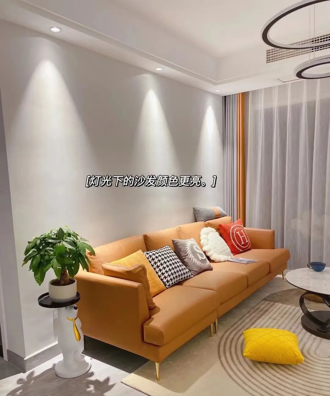沙发背景墙刷了浅灰色,没有任何装饰,连装饰画都没有,非常简单大方,干净利落,顶部散发出的灯光笼罩在墙上,满满的氛围感,橘黄色沙发搭配条纹地毯,气质中带着一丝活泼俏皮,避免了大面积灰色带来的沉闷单调。