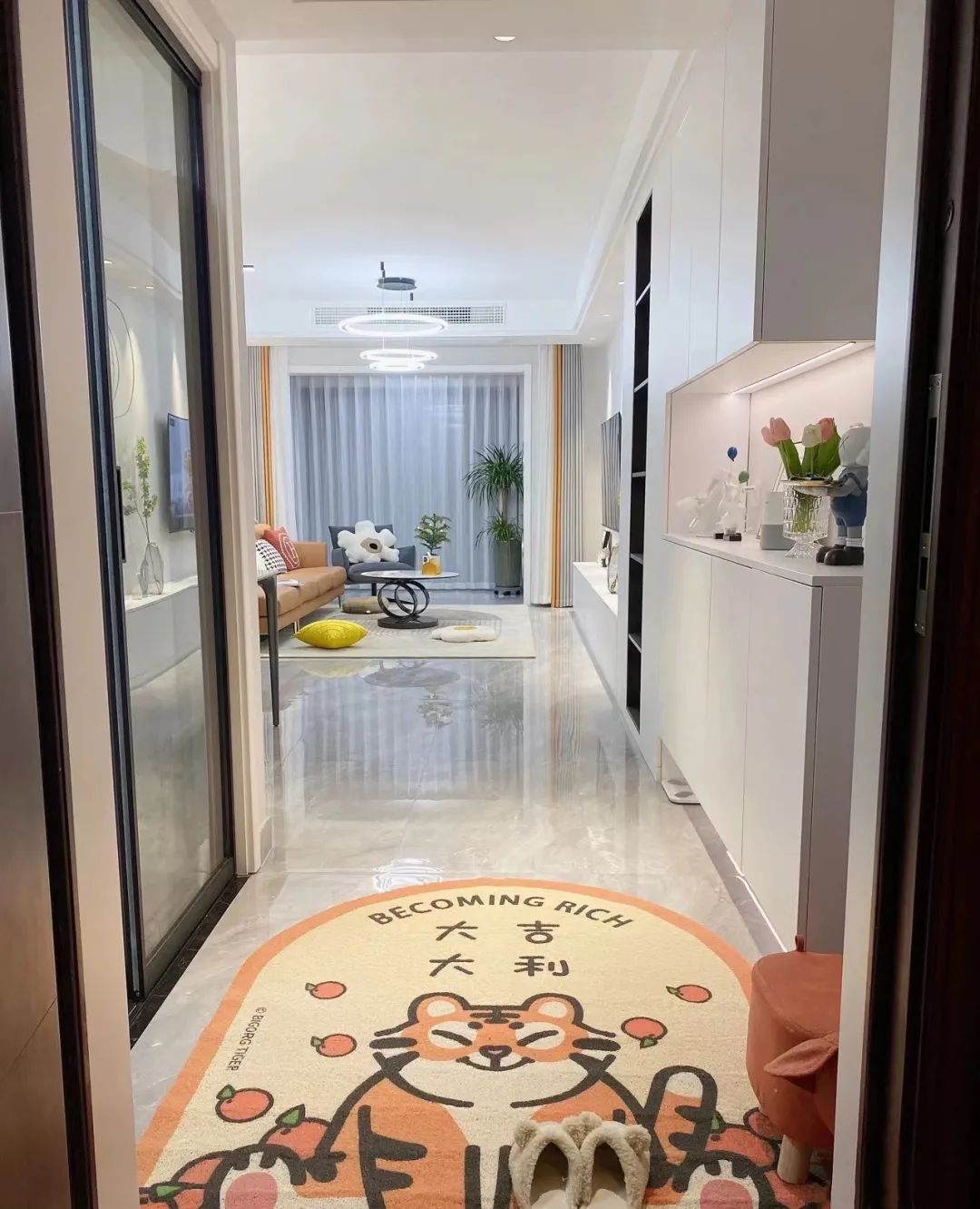 进门就被吸引了,定制的一体柜将鞋柜、餐边柜、电视柜结合在了一起,省空间又满足了多种需求,按压式柜门特别规整,避免了传统拉手的累赘突兀感。鞋柜的部分做了悬空设计,既可以存放钥匙包包等小物件,又可以摆放常穿的鞋子,里面还装了藏光,晚上回家就不用摸黑了,门口铺着一张老虎门垫,很是有趣可爱,进出门看见心情都会好很多。
