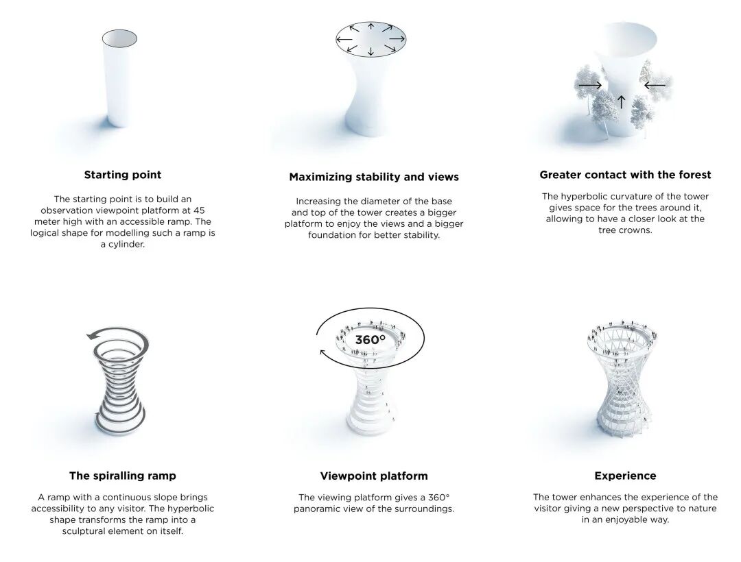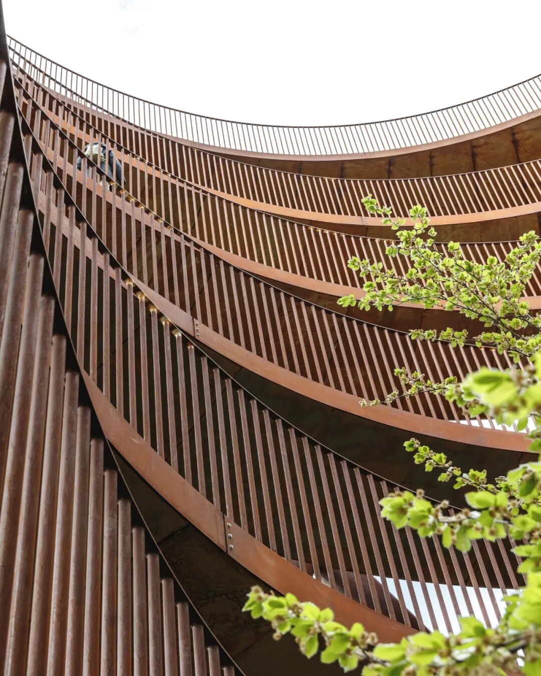 双曲面塔楼具有直立钢结构元素,不仅简约展现了视觉吸引力,更具备对环境的深层同理心。塔身结构由耐腐蚀钢材(weathered steel)和当地原生橡木板条筑成,轻轻融入自然色调,与周围树木形成丰富的共鸣,将成为Camp Adventure公园的必游之地。
