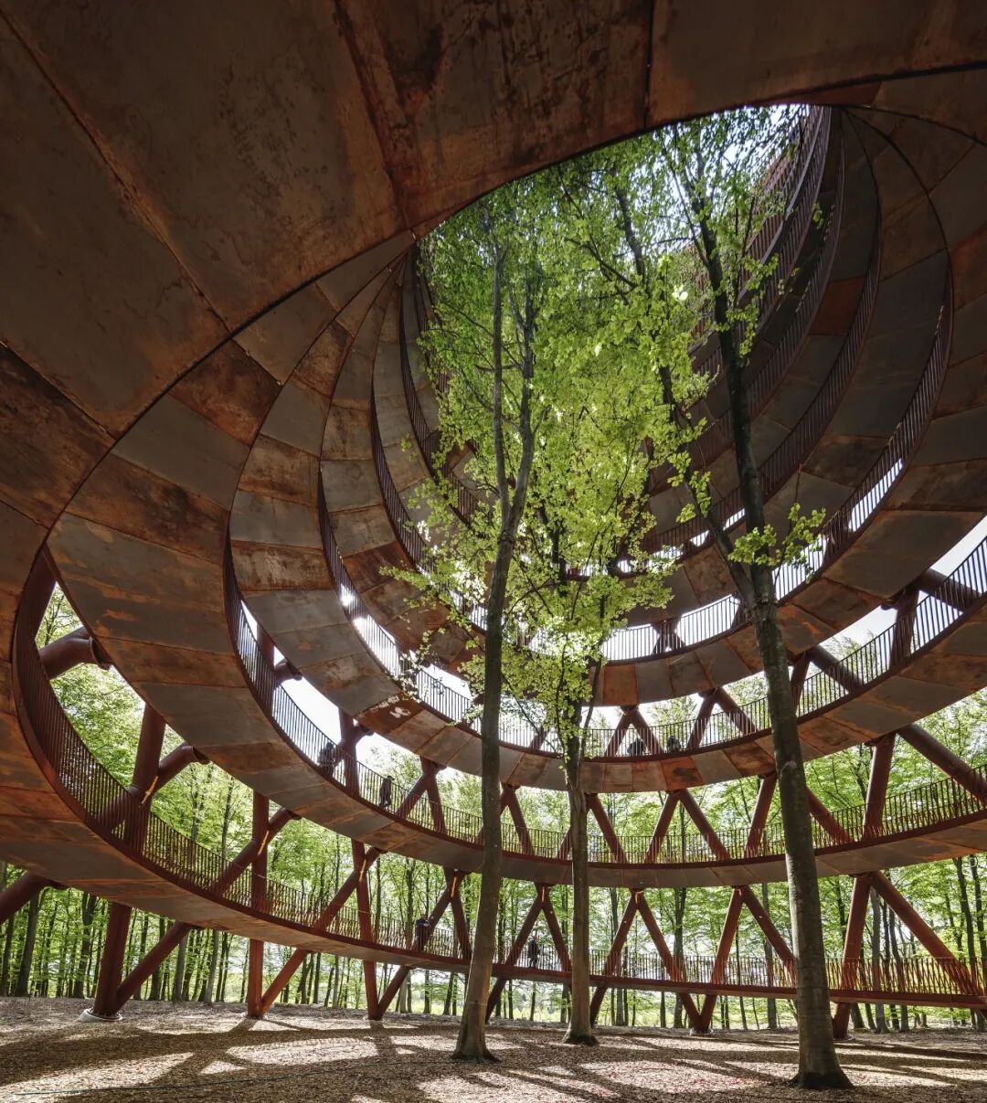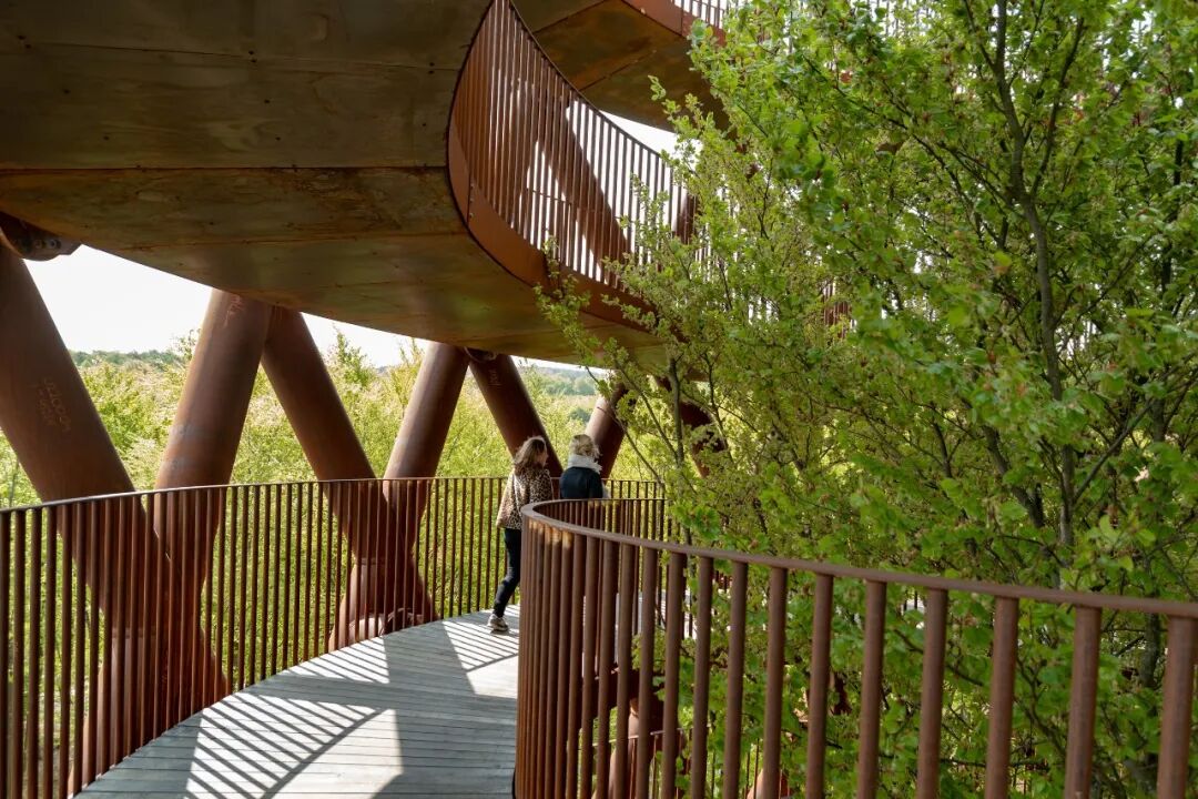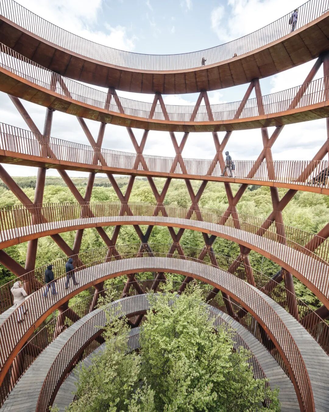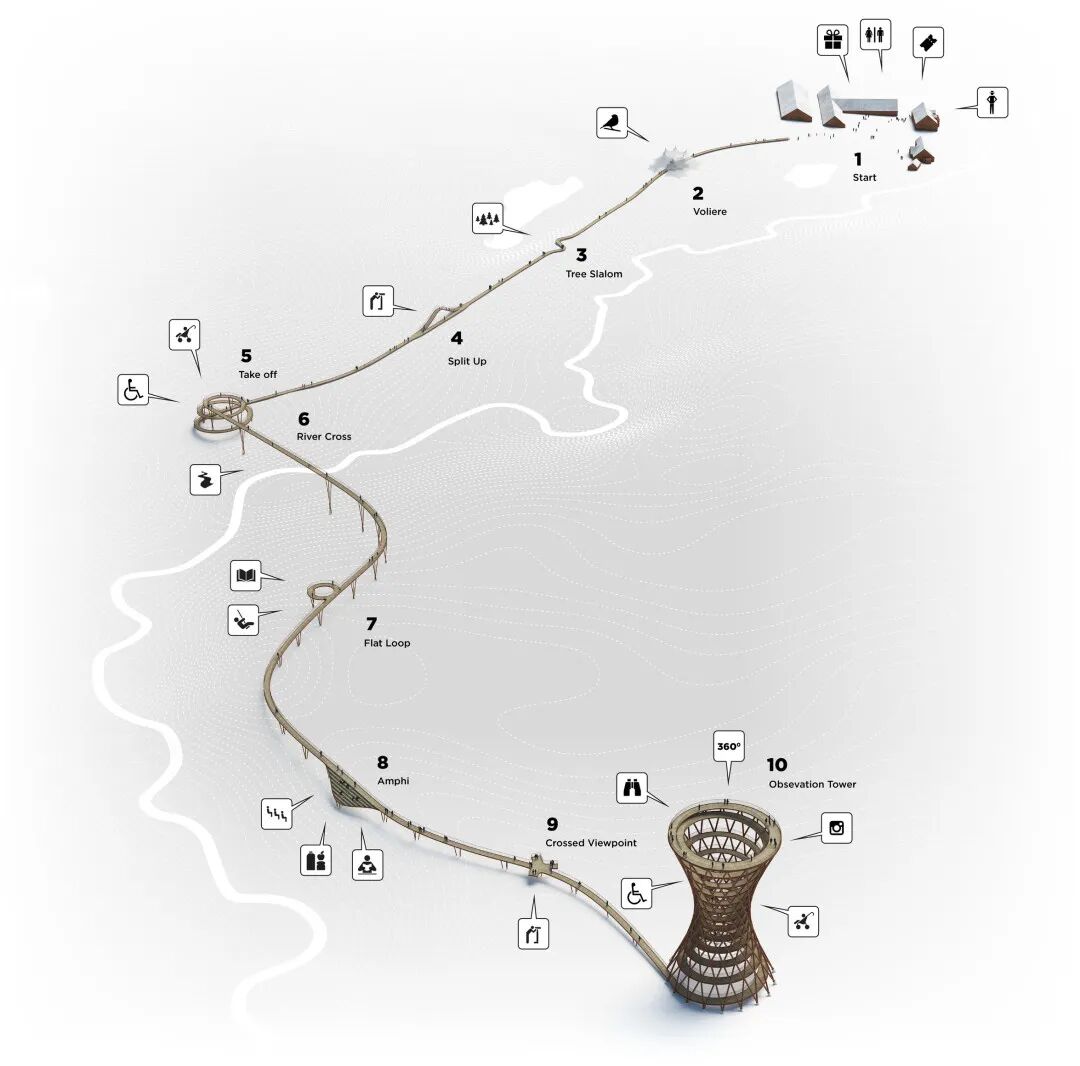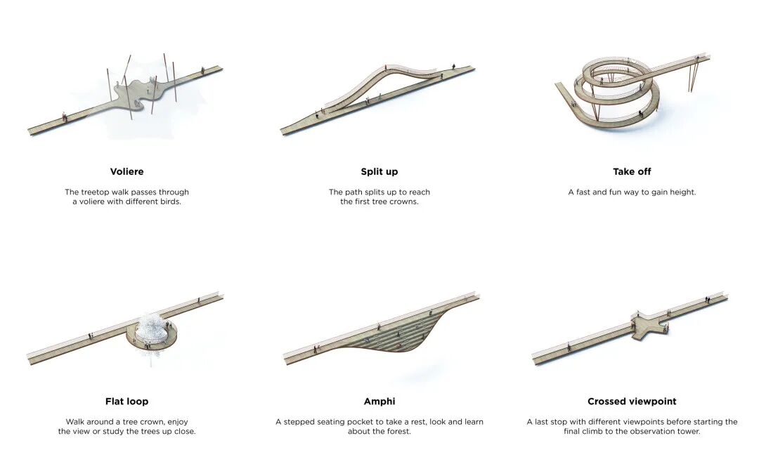 步道和塔楼都以没有台阶的无障碍木质坡道为特色,将访客缓缓带向观景台最高层——通过螺旋坡道,所有人不分体能条件,都有机会登高远望,从各个角度欣赏茂盛的森林冠层和特色自然风貌。林间步道也提供阶梯座位,三度空间停看听,游览的步调可以自由掌握。