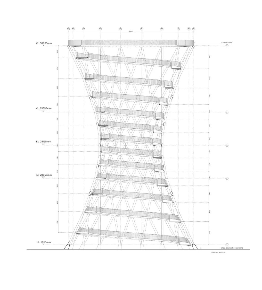 工程师和建筑师还致力于优化钢材的使用,通过数字驱动的程式确定了45米的最佳塔楼高度。塔身几何形态也通过坡道倾斜度需求来确定,以期所有访客都能够漫步上观景台。我们还使用脚步模拟软件帮助计算访客在复杂步道上行走的舒适度。