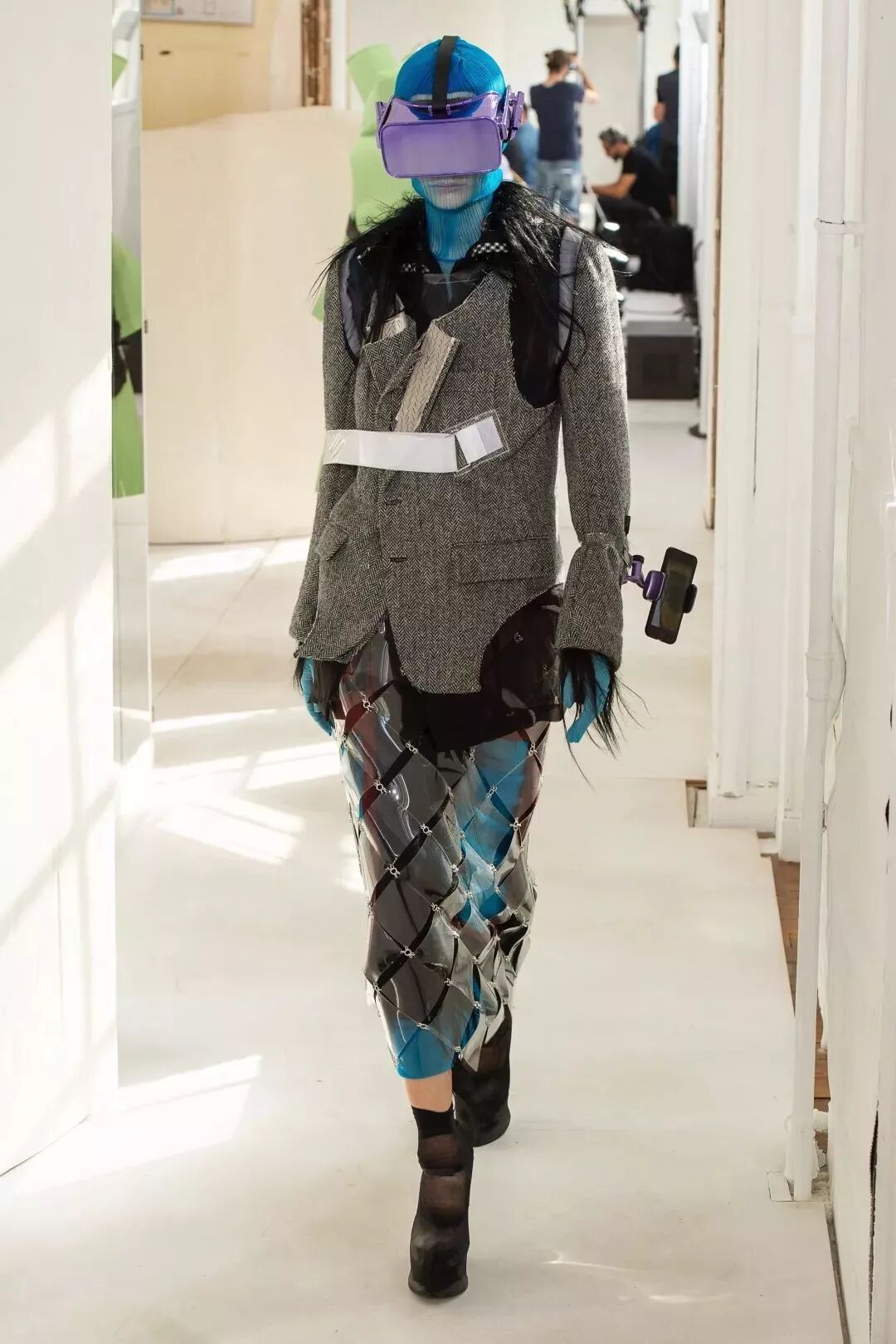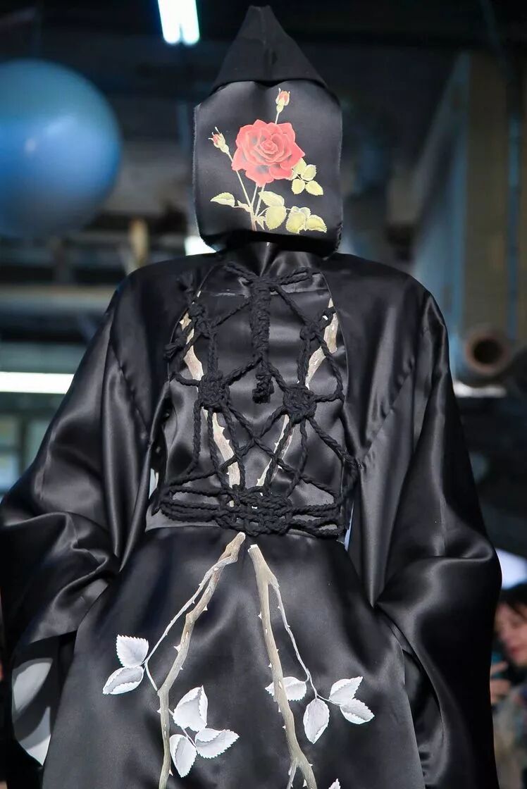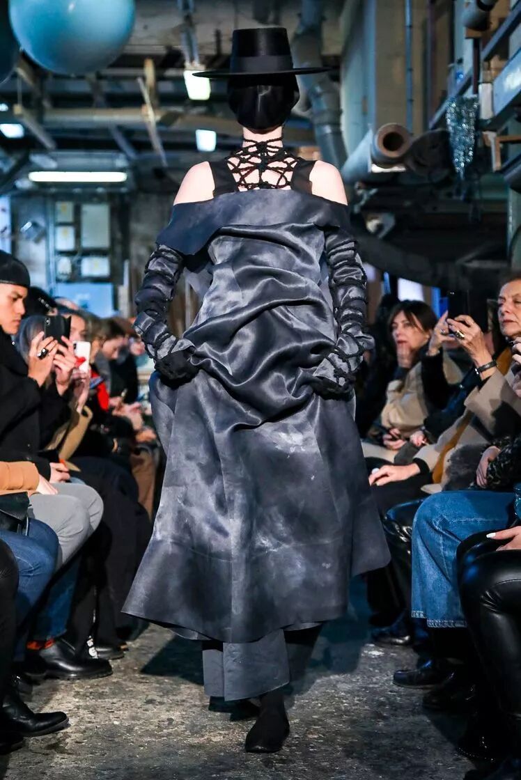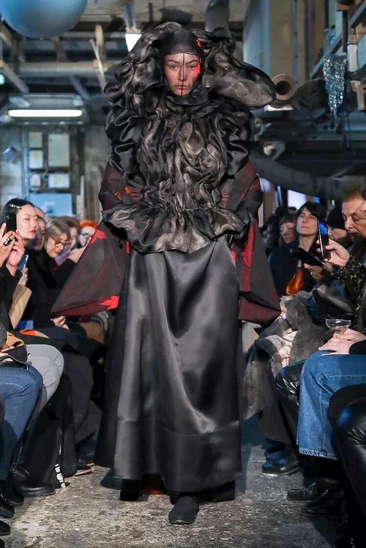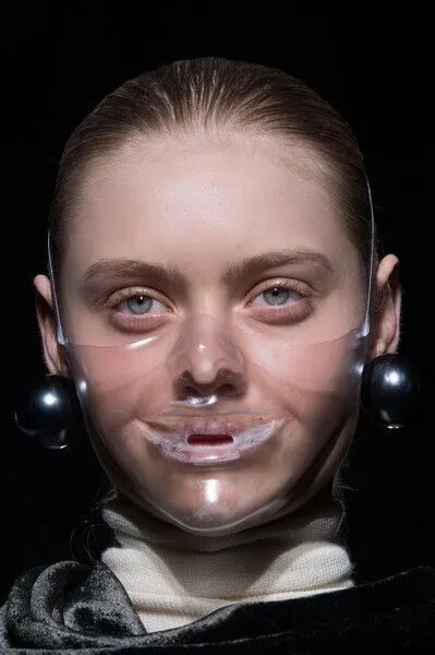 擅长在脸上做文章的Aganovich,很喜欢做“身体畸形”的反时尚戏剧化美学,Aganovich在怪诞天马行空的同时总是充满着思考,荒诞怪异的装扮下,每位模特的脸被面纱挡面,令人毛骨悚然。