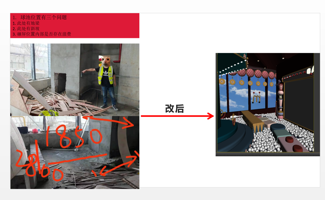 在双方的重新的沟通和默契配合下,成功解决了该处球池存在地梁和斜坡的问题,甲方也连人带图一起被光荣地收录进该项目现场问题汇总PPT