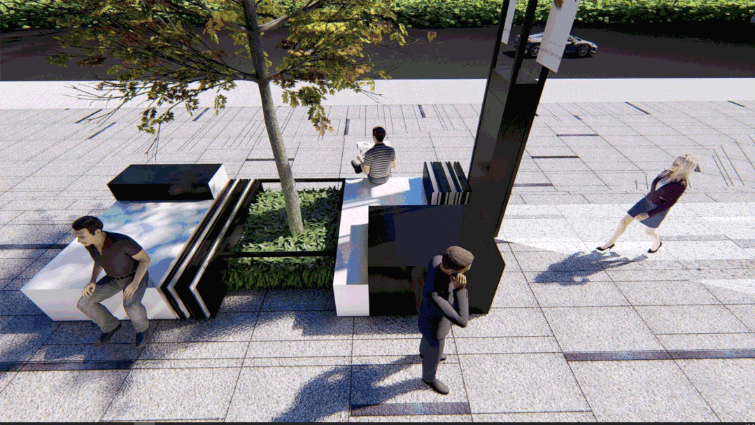 该入口设有公交站及出租车招呼站,作为另一个主要的入口门面,给予民众活力且创意的介面,棋盘格状的高差花池以及高低错落的精緻水景,让人不自觉地漫步其中享受精緻生活,体现项目的文化与创意。