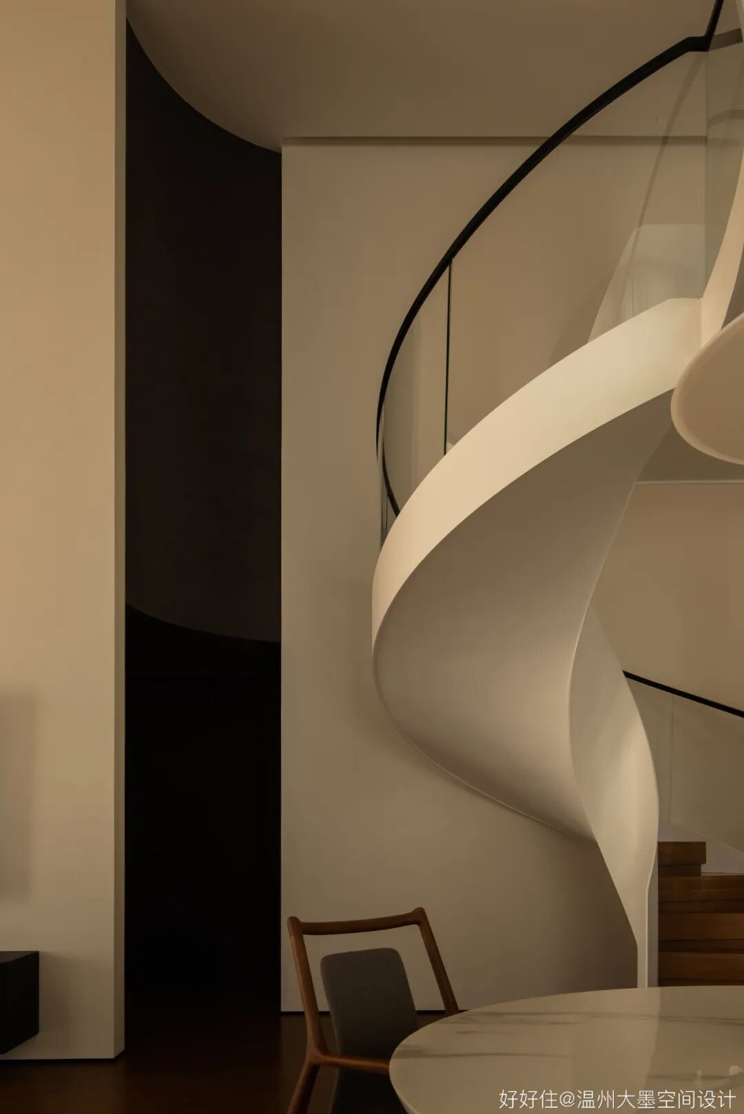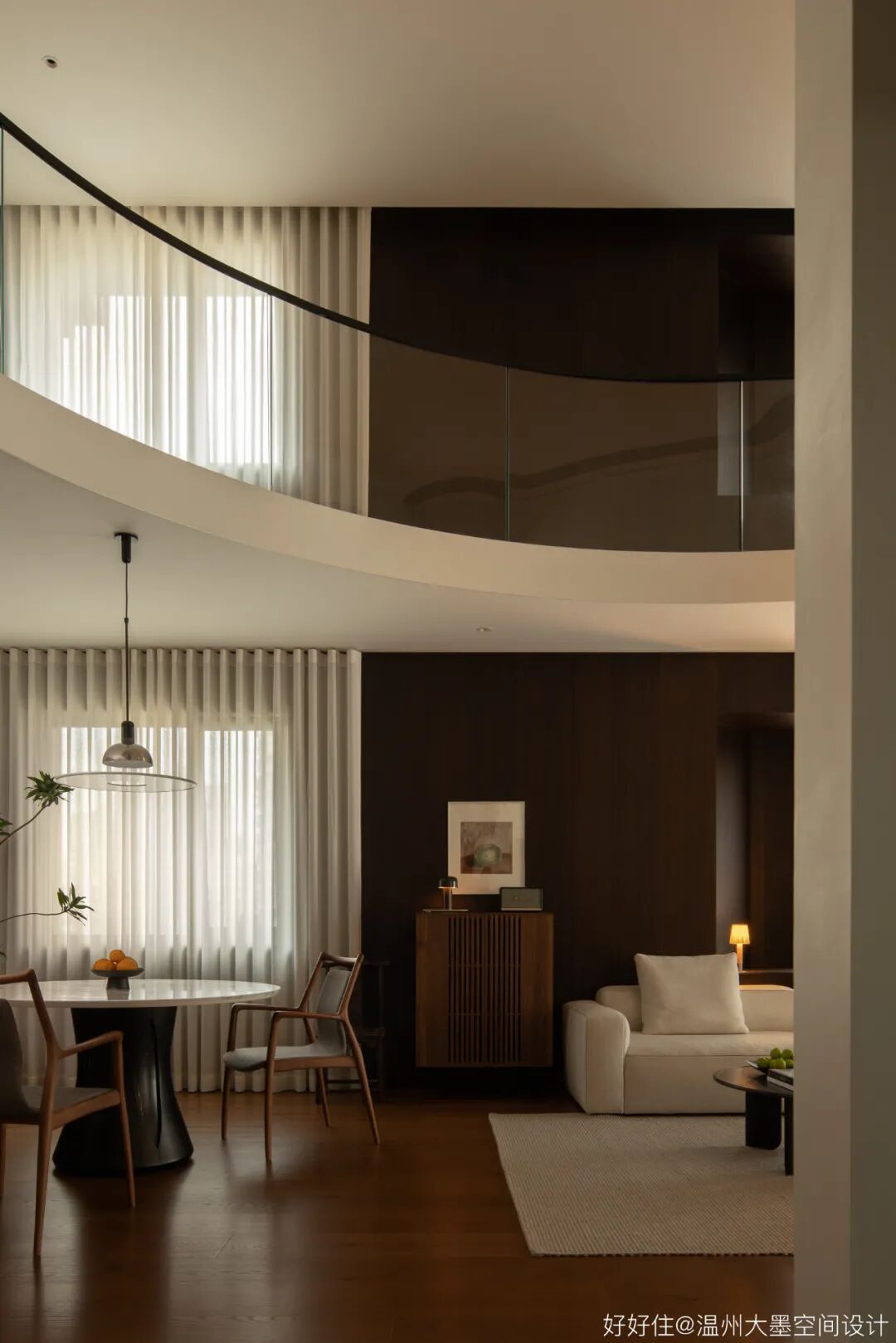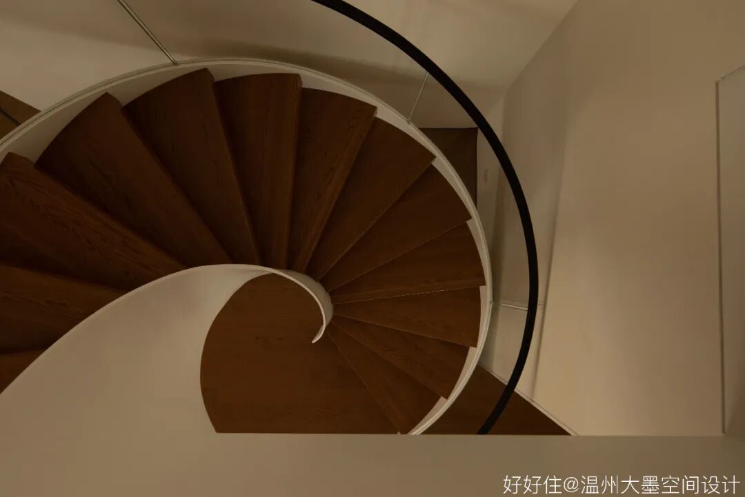 中空跃层通过旋转楼梯联系两层,旋转的弧度一直蔓延至二层走廊设计,为空间增添柔和曲线的美。