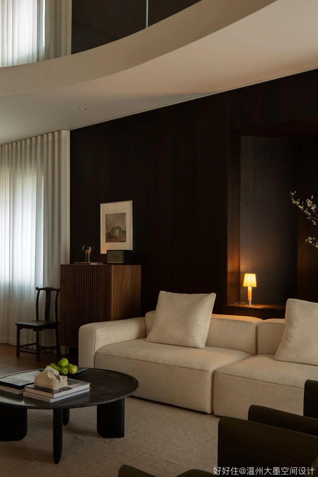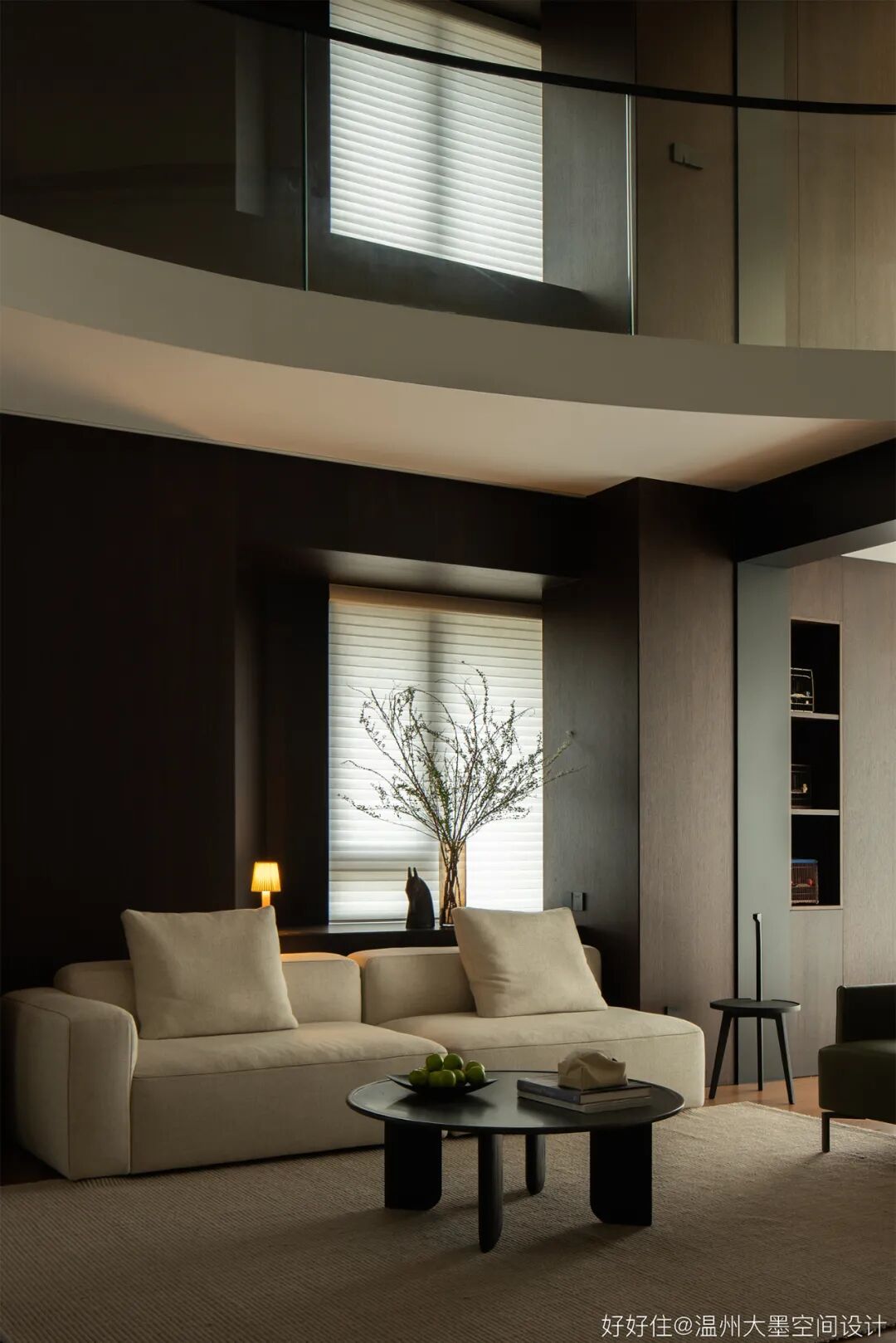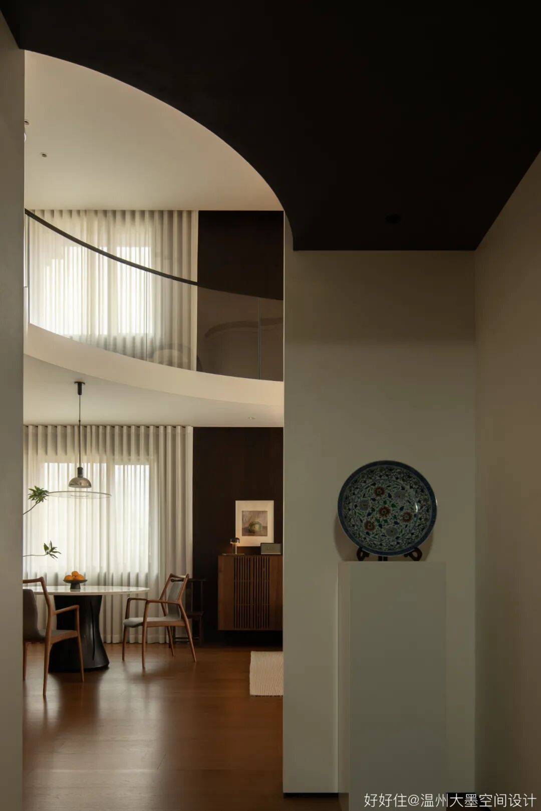 中空跃层通过旋转楼梯联系两层,旋转的弧度一直蔓延至二层走廊设计,为空间增添柔和曲线的美。