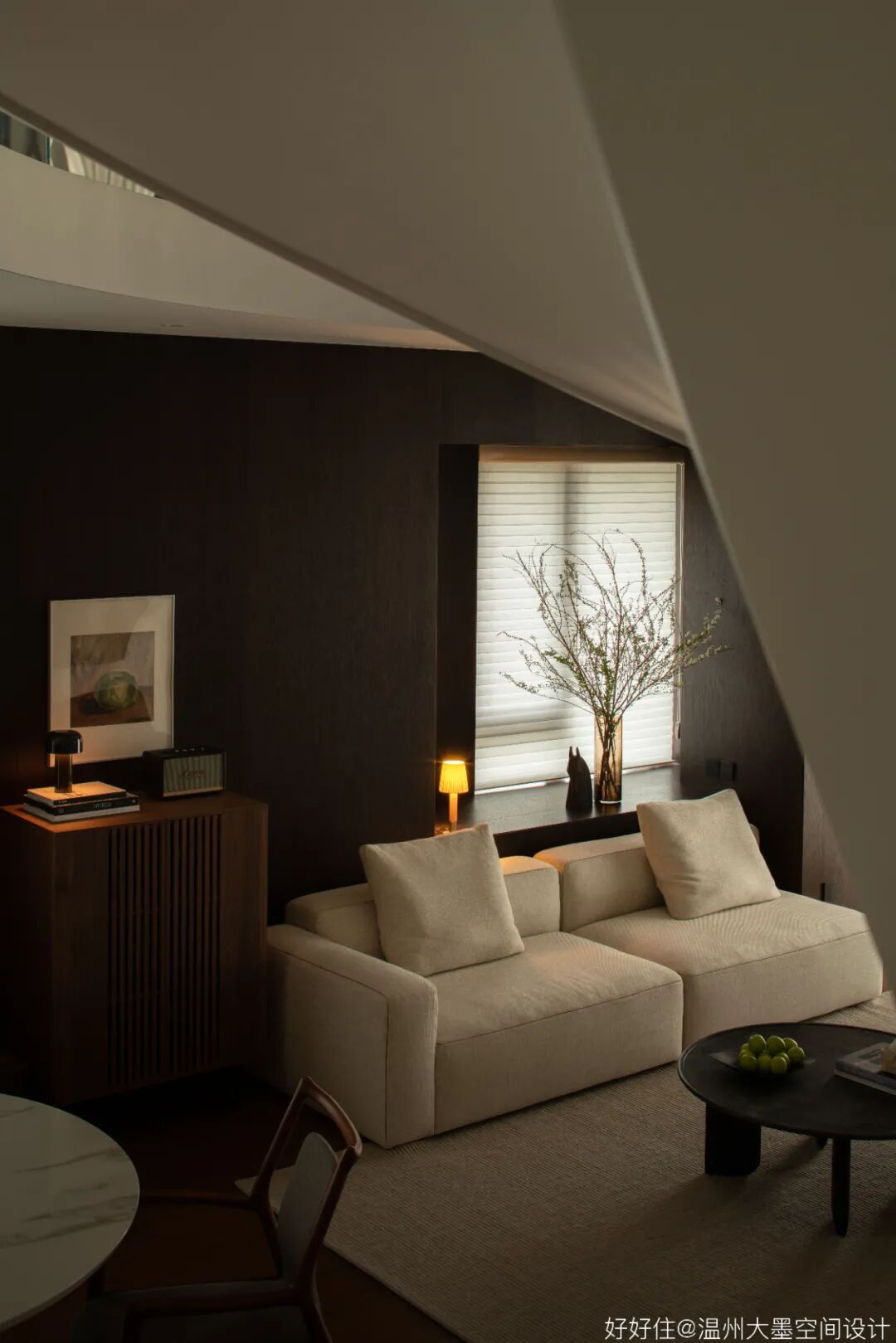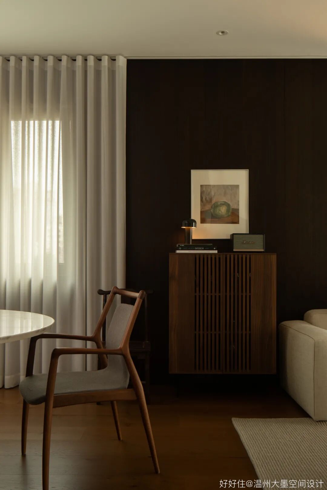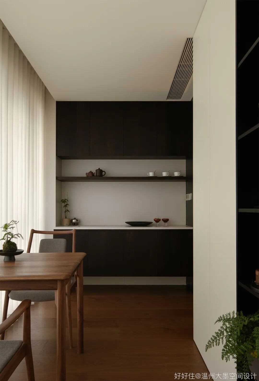 深色调的橡木带来空间沉稳的基调,搭配实木边柜还有预留的窗景台,再将氛围感交予光亮与阴翳的完美结合。