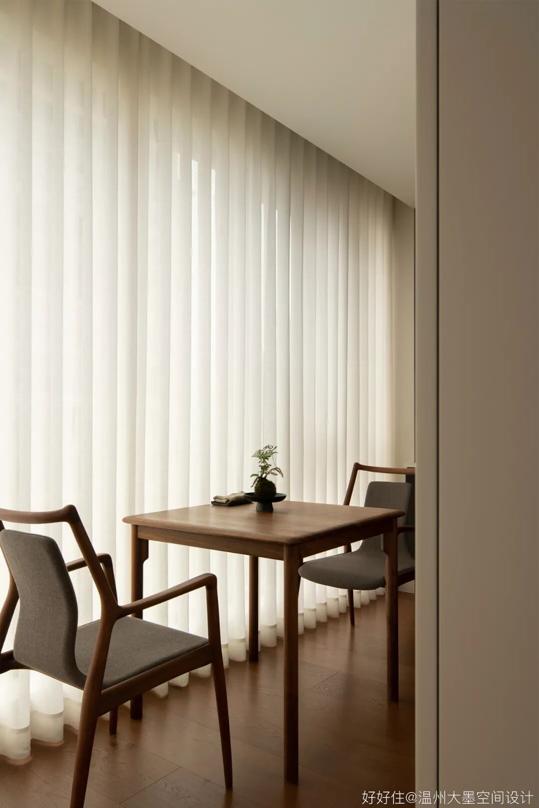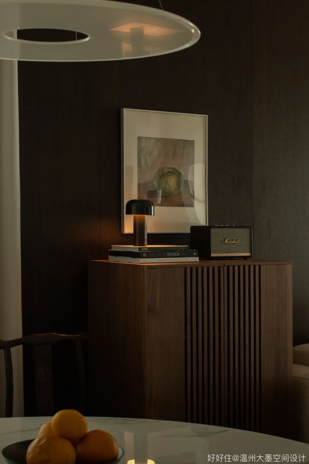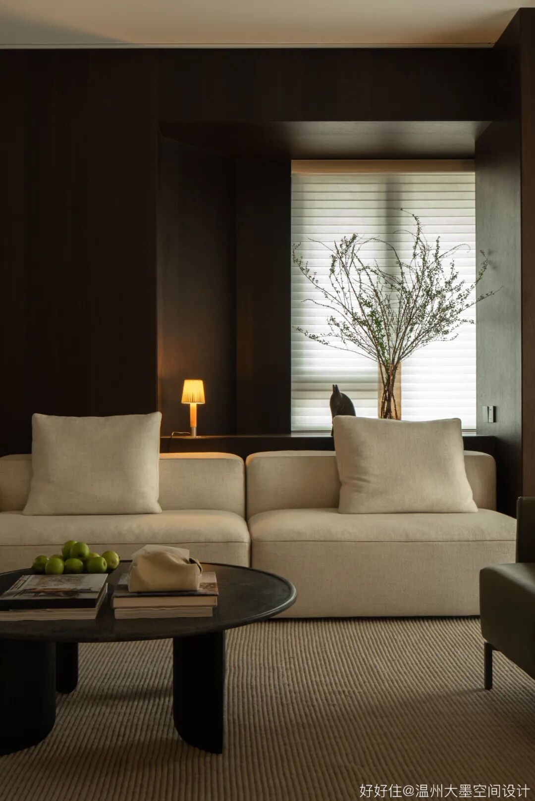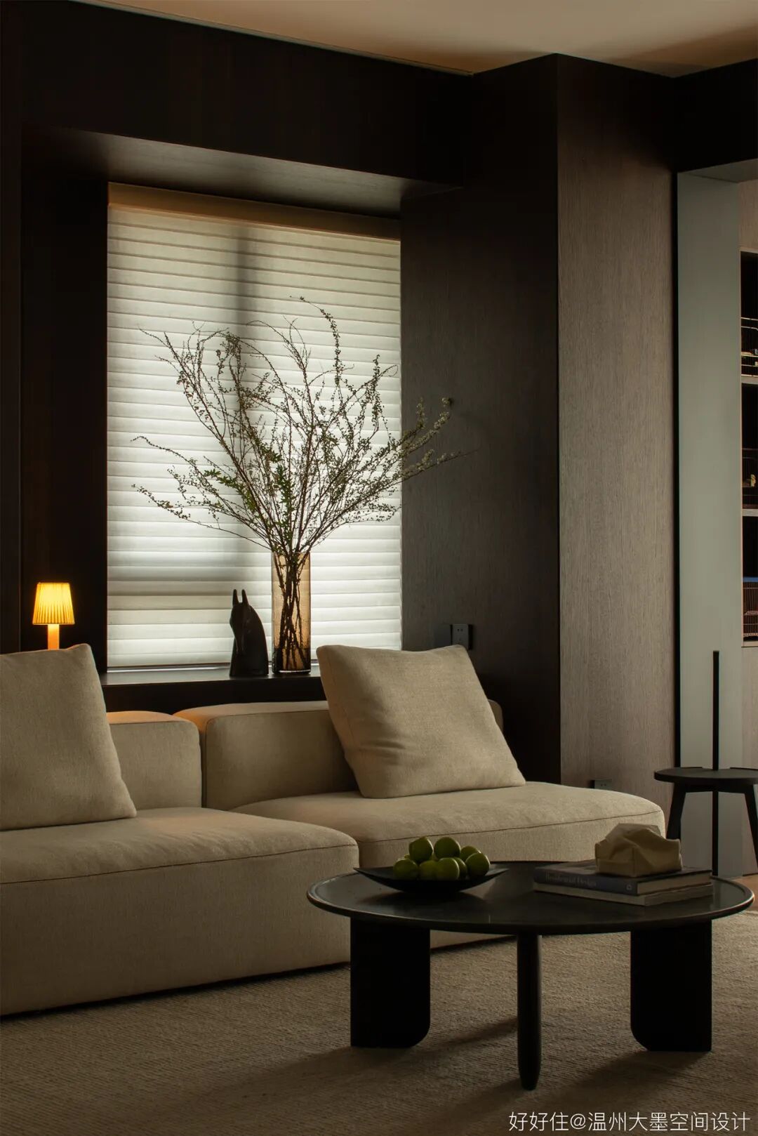 深色调的橡木带来空间沉稳的基调,搭配实木边柜还有预留的窗景台,再将氛围感交予光亮与阴翳的完美结合。