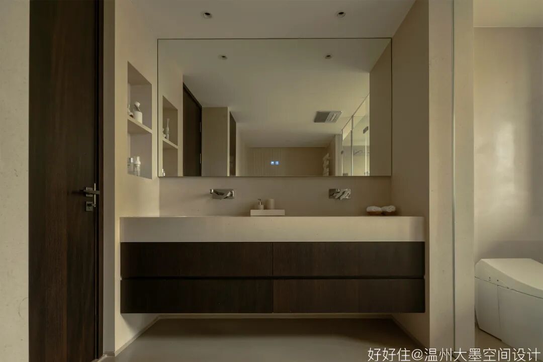 重新定义空间的使用界限,通过多变的空间形态以适应更多的使用场景。业主夫妻在使用洗手台的时间上较为一致,所以我们设置双台盆的洗漱区域。