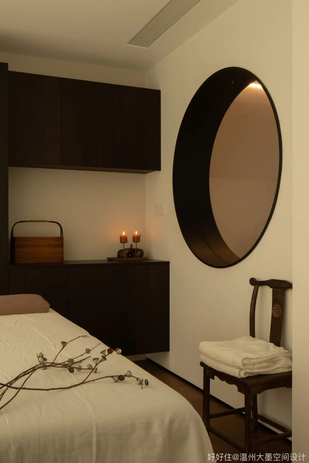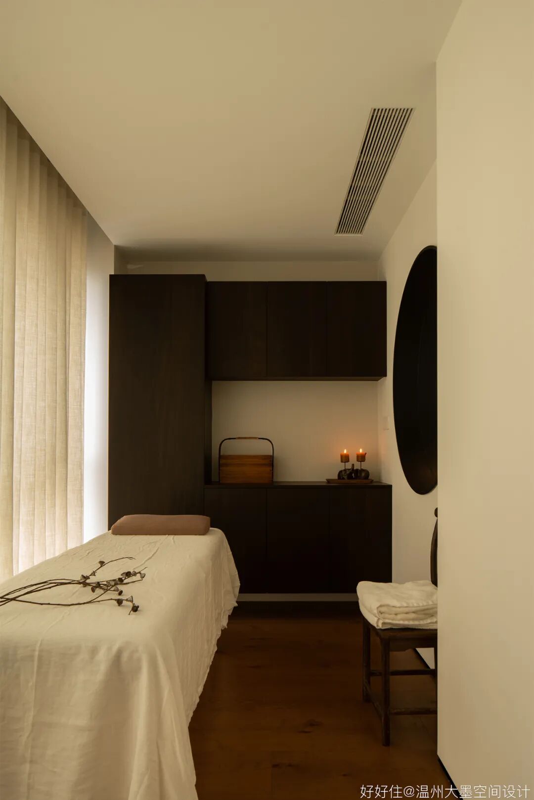 女主人是一个很懂得养生并且喜欢瑜伽的人,所以在二层设置了一个独立的空间作为理疗师,我们在此设计一个“圆”,以此来响应人居生活。