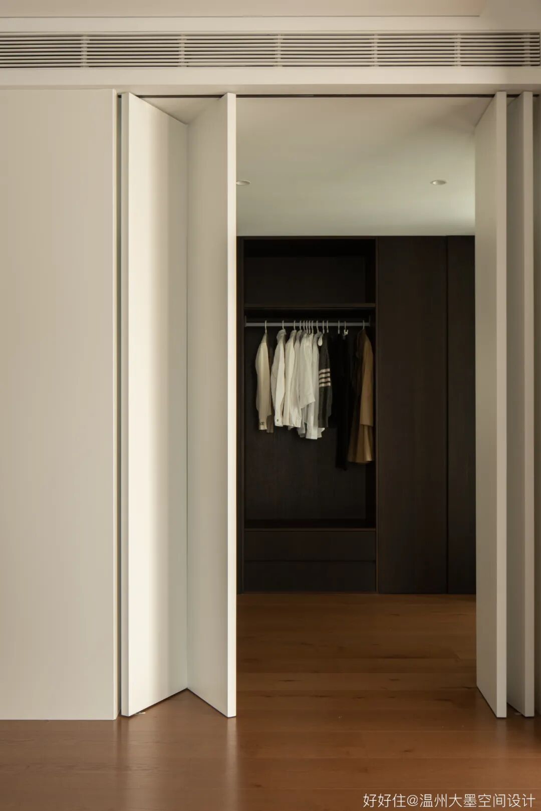 更衣室平面上邻靠卧室,缩短行为动线,创造便利的生活环境,入门使用白色折叠门,去模糊空间边界感。