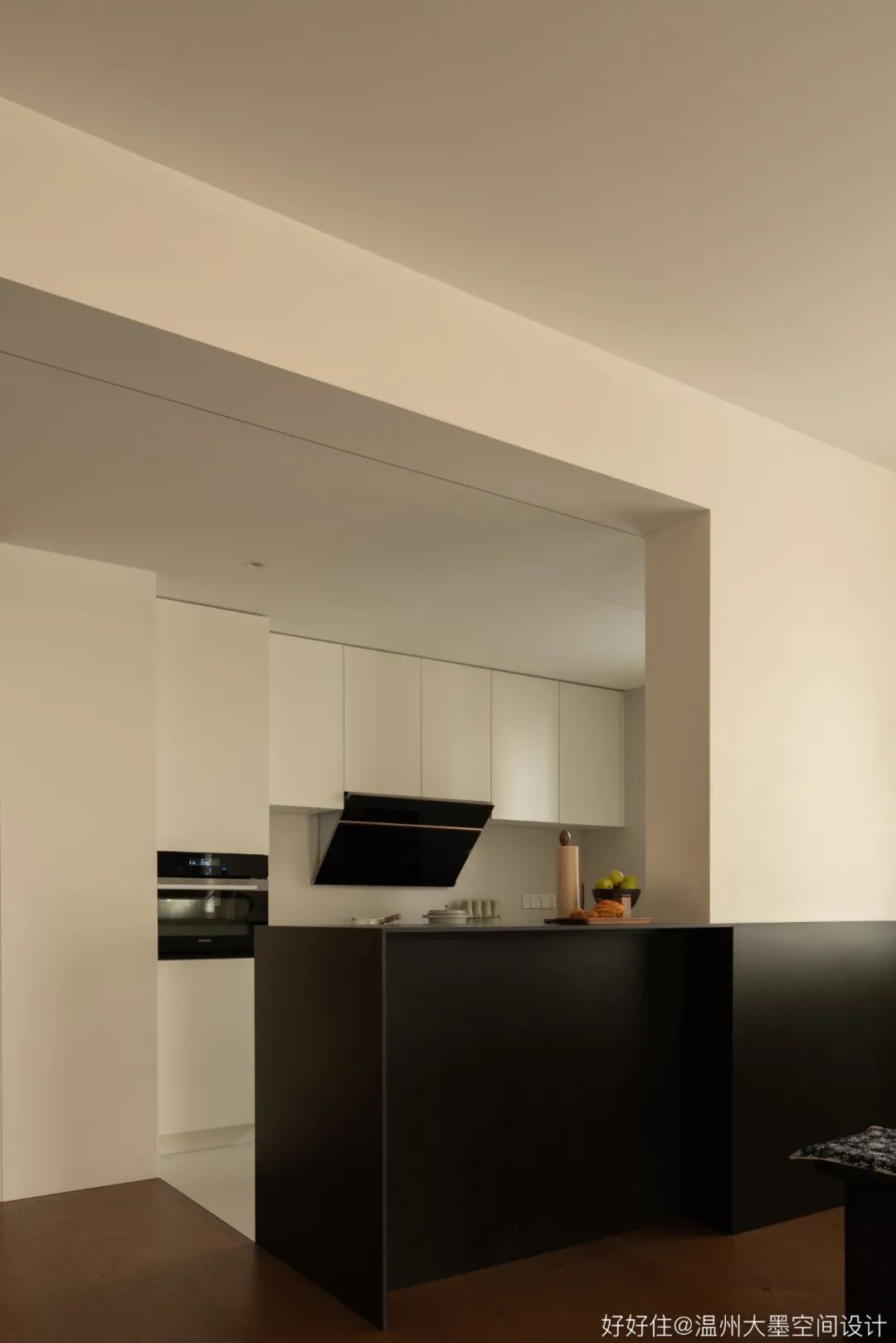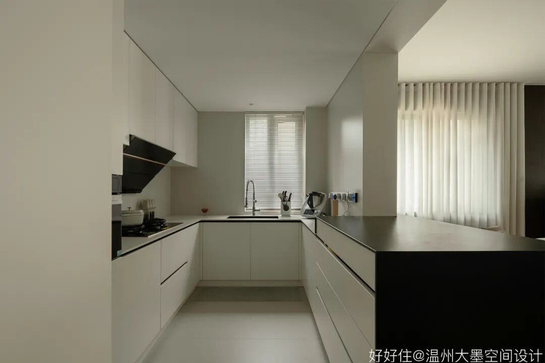 在现有条件下权衡利弊,寻找各因素之间的平衡关系。线条的走向,块面的分割,色彩的取舍,实用的考量,是开放式厨房必不可少的思考环节。