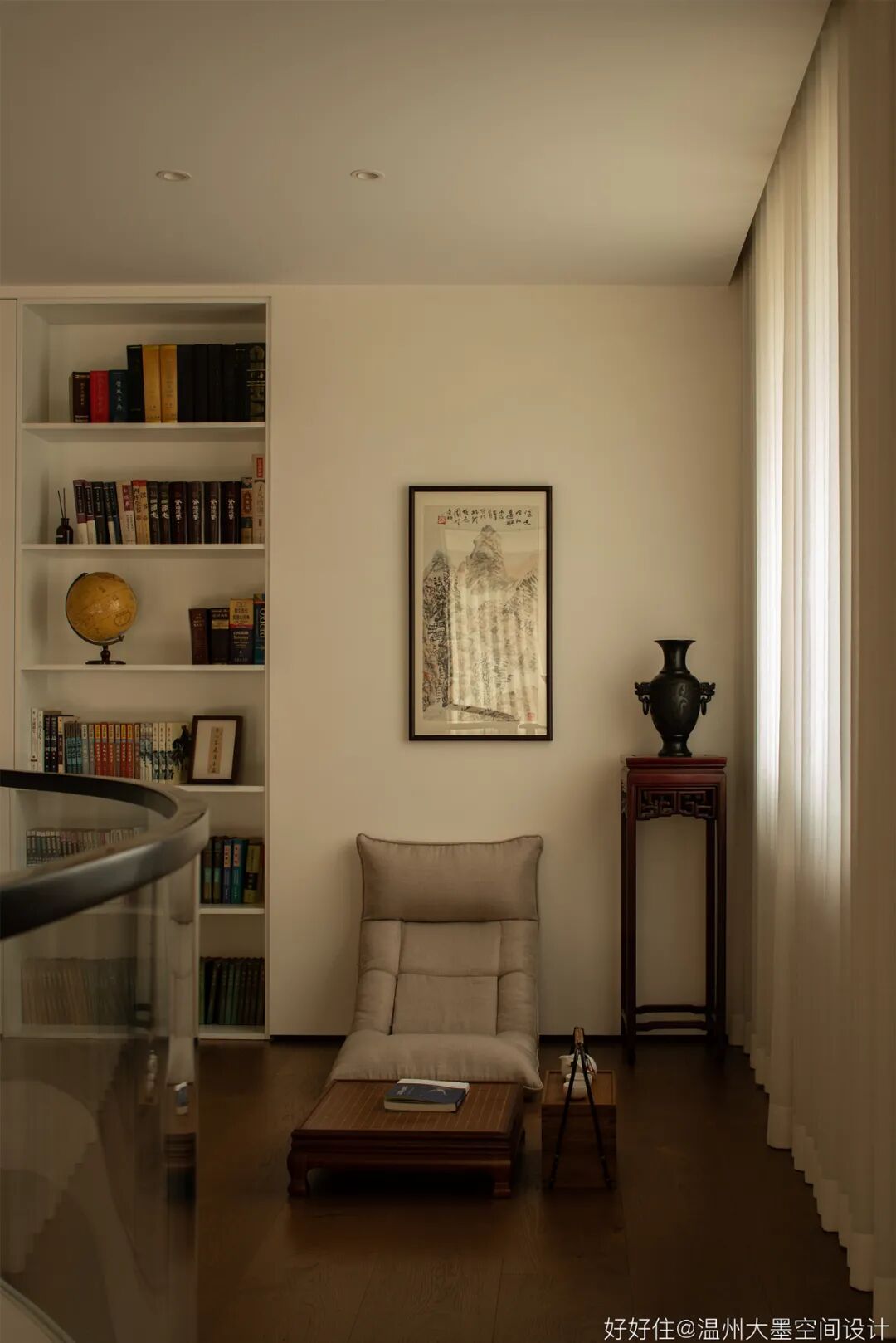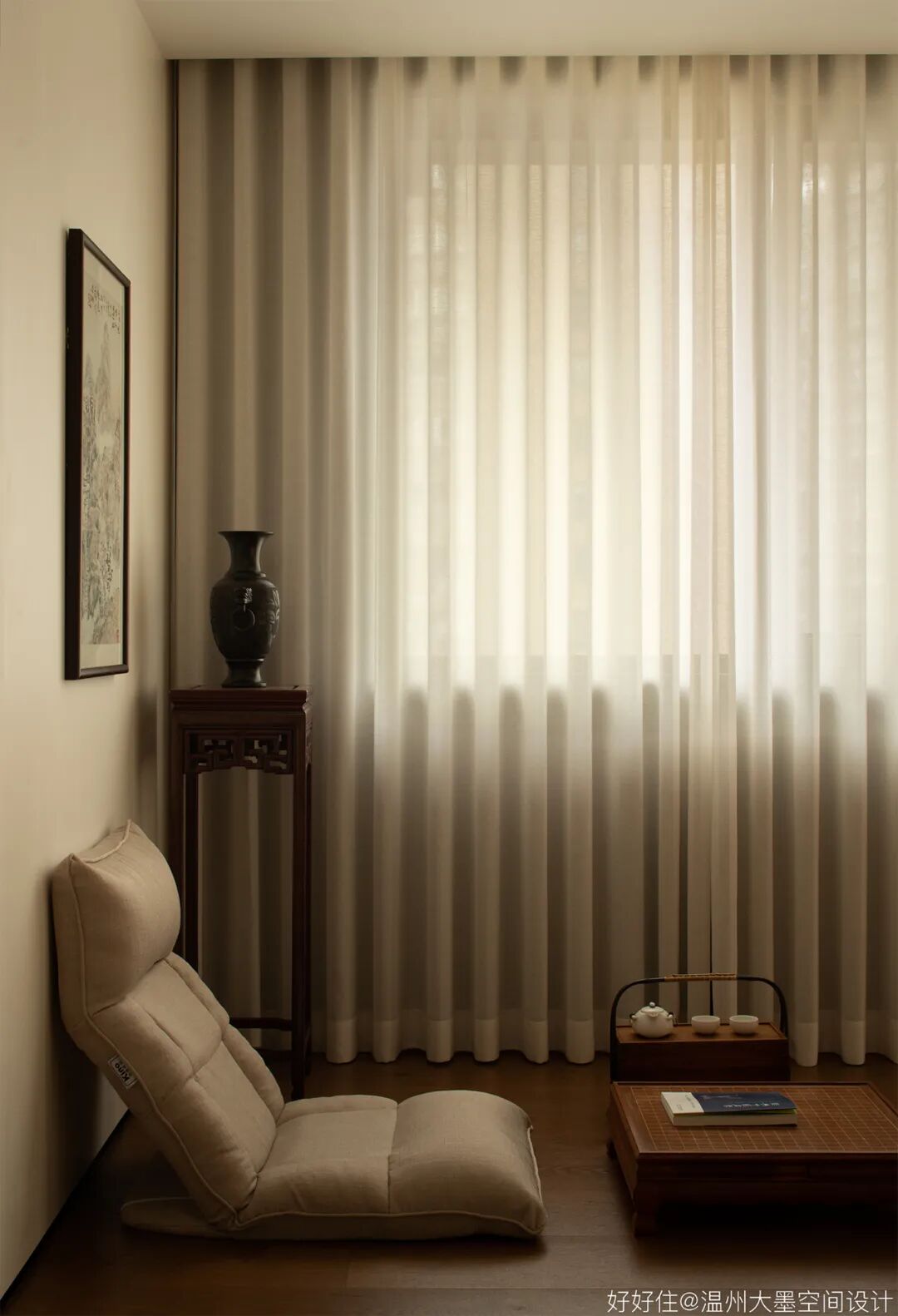茶室空间以男主人使用习性为考量等,空间的属性以通透为主,所以我们尽量选取造型精致、体量小的家具,打造属于他沉思之所。