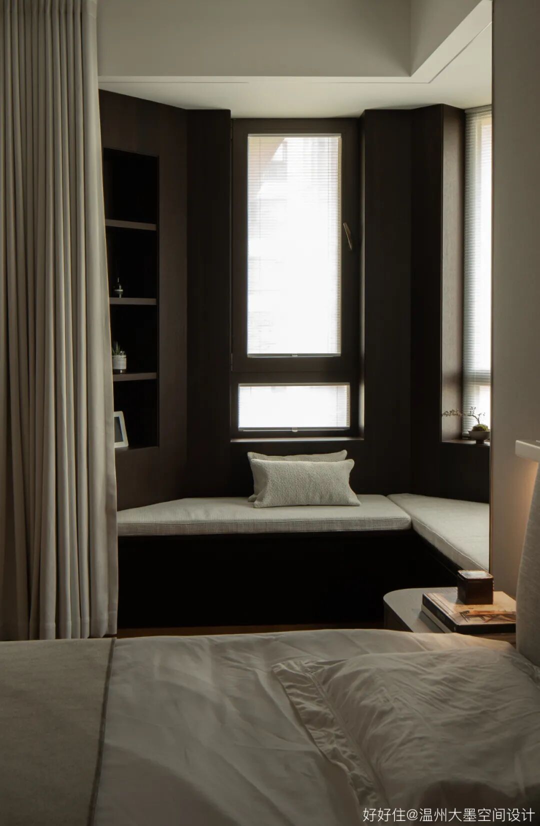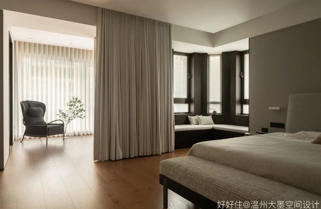 主夫妻在家的休息时间上有差别,所以我们在主卧设置了两道窗帘,入睡时我们最里侧的遮光帘闭合,即使男业主早起也可以在主卧的第二道窗帘外进行休憩,这样避免了夫妻作息时间不一致对于对方的打扰。