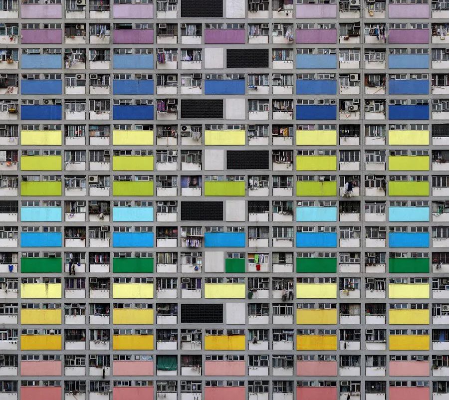 照片中看不到建筑的边界,沃夫消除了天空与地平线,只有不断延伸生长的横竖线条与规整的格子,他们记录着香港密不透风的建筑布局,震撼之余是不断的重复,又重复。