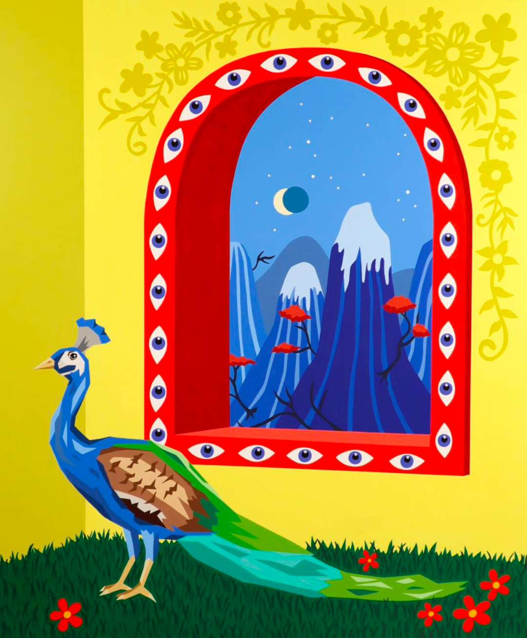 BRITTY EM,孔雀的神秘之窗 Window of Mystery with Peacock,亚克力、帆布 Acrylic on Canvas,120 x 110 cm,2022年,致谢艺术家及艾普利畫廊