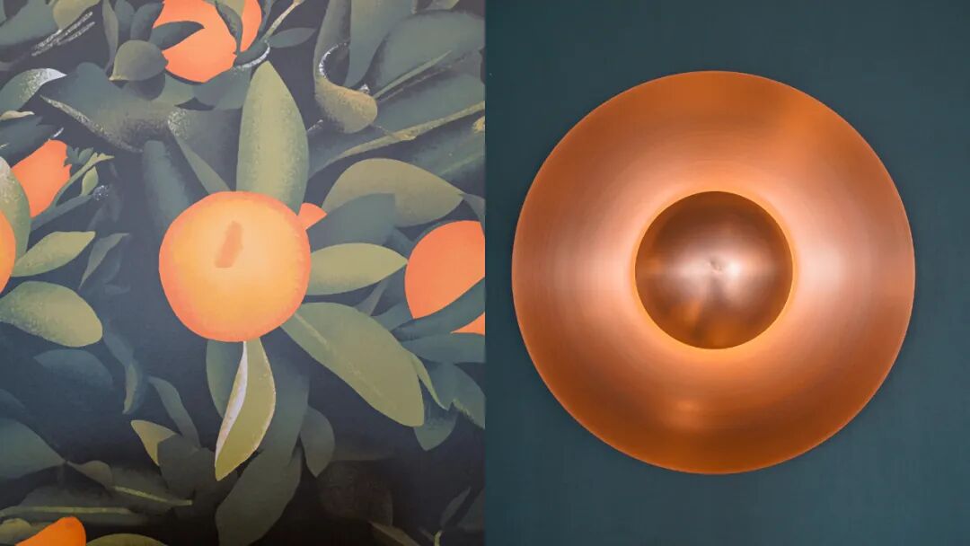 ▲ 墙面的壁纸和形似“炙热的太阳”的金属挂件,为室内融入了绮丽依然的自然气息。