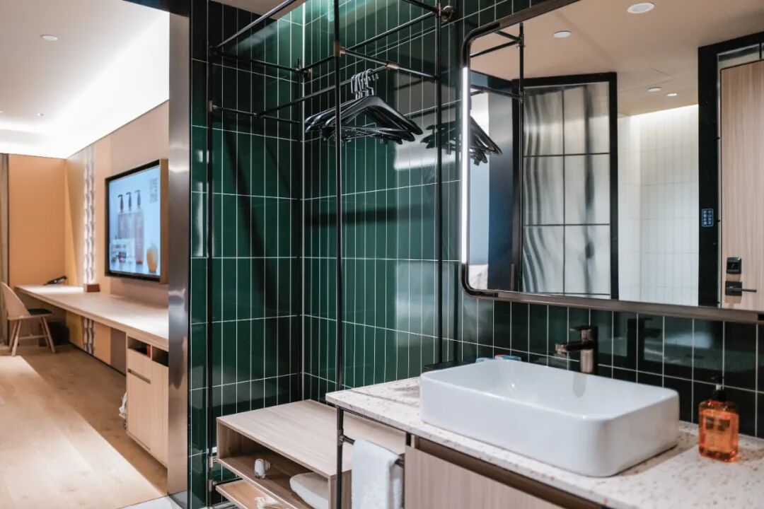 客房的衣帽间和浴室空间与入户玄关巧妙交融,开放式衣柜、行李架、盥洗台、穿衣镜,有致地呈现于革新演绎的入户空间四周,让现代旅居中倡导的务实高效,得到最积极完满的回应。这处全新演绎的融合式空间还运用墨绿色瓷砖装点墙面、用半透明的格子框拉门守护浴室隔间,让空间感官更舒畅愉悦、也让空间层次更流畅有致。