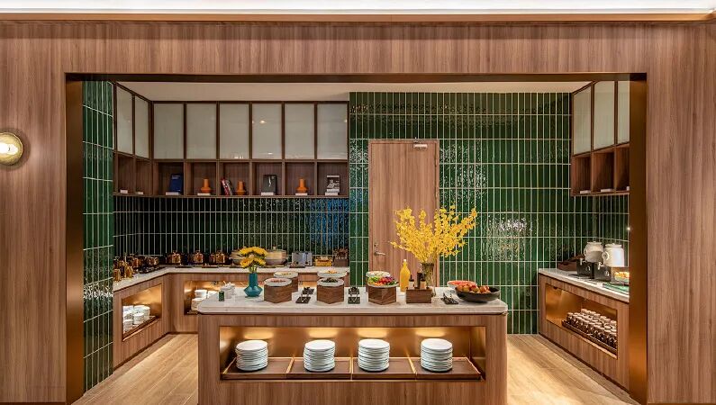 餐厅也延续公区橘色和绿色的主色板,搭配木制镶板与藤编家具,营造了一派仿若置身“悠然田园”的用餐氛围,让每一天都能活力满满地开启。
