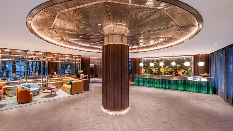 大堂左侧是一张超长共享桌和自助茶点站构成的共享区,让工作、社交、休闲流畅交融。映衬共享区的墙面和地毯缀满了桔子元素图案,烘托出自然活力的氛围。悬于木制镶板墙头的金属框圆形壁画仿佛一枚巨型胸针,既揽入了桔园的宁静悠然、也成为厅堂的点睛装点。一旁的自助茶点站承载着新鲜调制的茶饮和桔子风味糖果,让人尽享安逸与从容。
