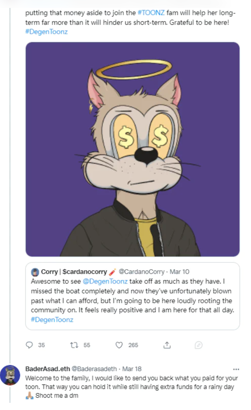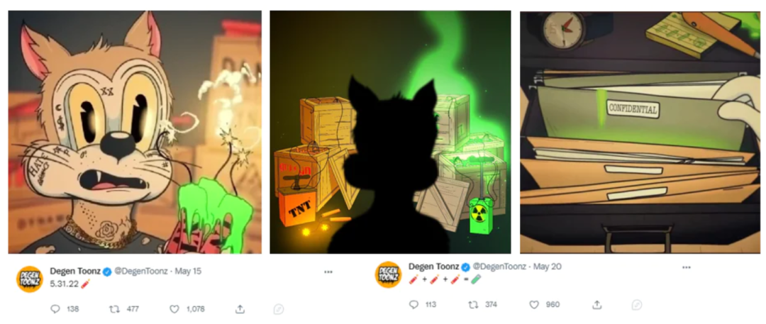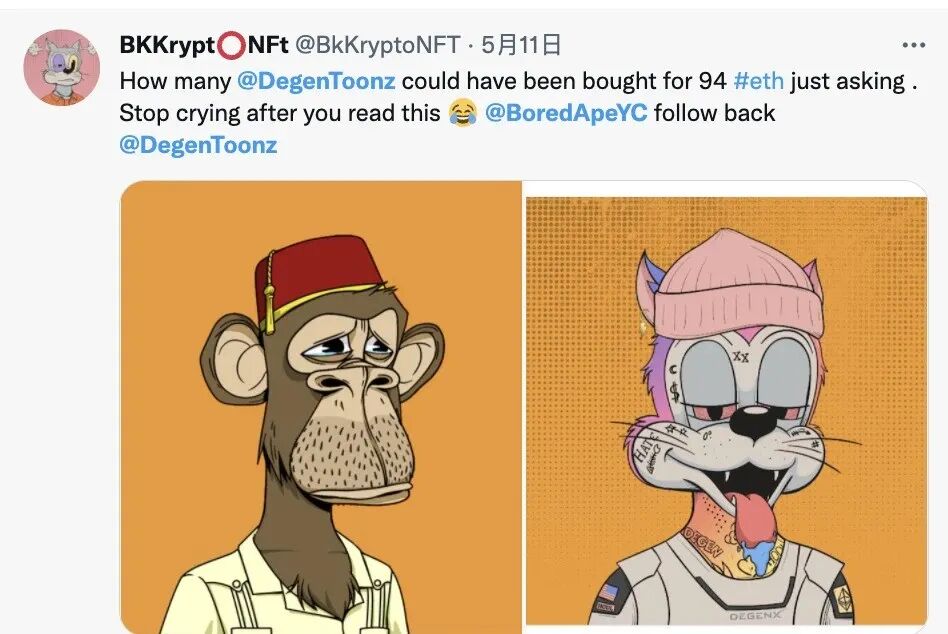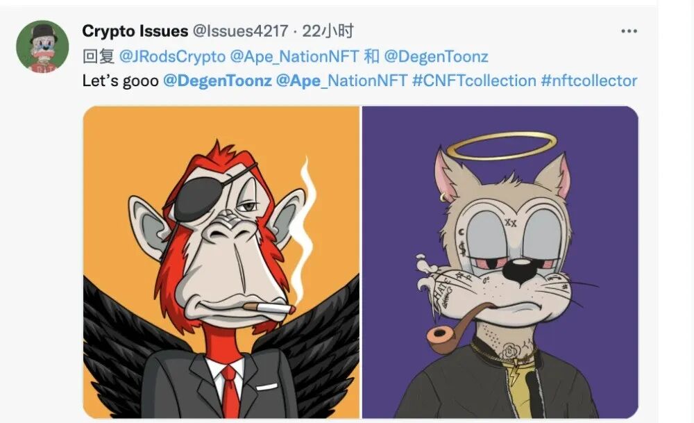 甚至有不少无聊猿收藏家在推上宣布了自己把头像从无聊猿换成了Degen Toonz猫,乍一看这些颓废猫还和无聊猿有一些神似。