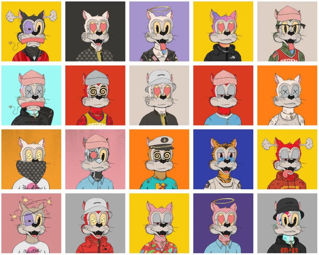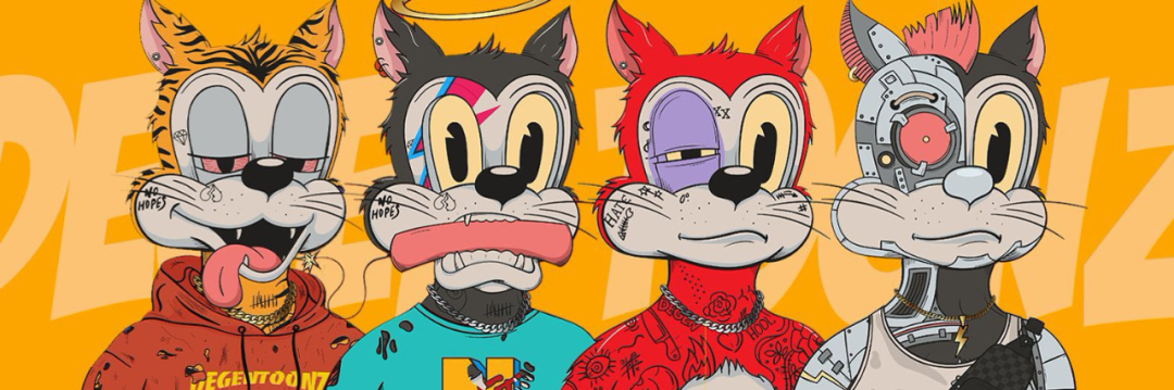 Degen Toonz是一组8,888个复古美式漫画风的颓废扑克脸猫咪,有点神似《Tom和Jerry》里的Tom猫。这种画风是基于早期迪士尼的rubber hose style(橡皮管风格),是一种美式卡通风格,比如《菲力猫》就是这种风格。