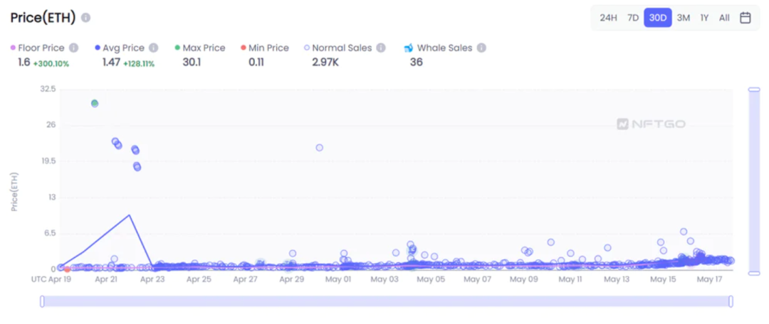 5月份以来,Degen Toonz成交量和均价均呈现稳步上升趋势。5月16日,巨鲸持有者hoolz.eth以11ETH 的价格购买了Robot Toonz,这是5月份的最高成交价。