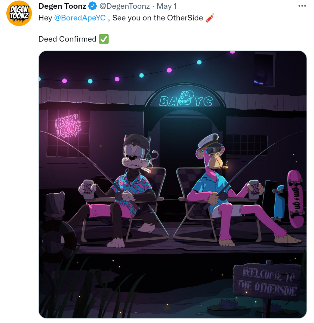 Degen Toonz也宣布入驻了无聊猿的元宇宙世界OtherSide。
