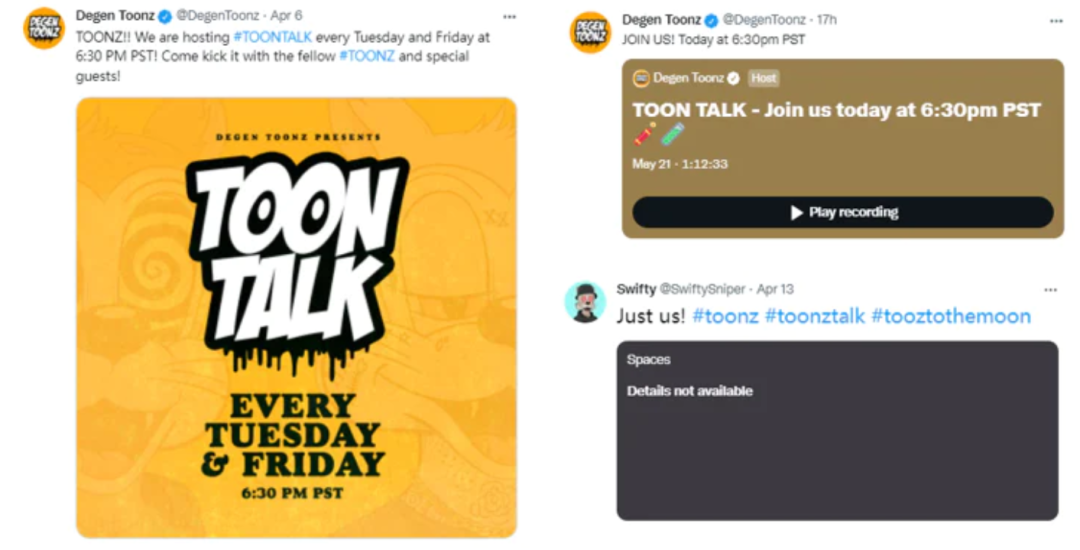 项目团队以热爱和社区交流著称,每周将会有两场官方举办的Twitter Space,由经验丰富的市场经理Joel Contartese 主持,Bader和Prince也没事就会来聊天,顺便透露一点空投的细节。