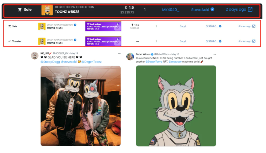 Degen Toonz出色的画作吸引了很多名人的关注,除Steve Aoki外,还包括说唱天王Snoop Dogg,知名演员Seth Green和Rebel Wilson,以及多位NFL和NBA球星。随着在网红和名人圈中的知名度和辨识度也不断提高——很多网红主动加入社区帮助宣传,为社区提供福利,而社区也以强大的号召力投桃报李,形成良性循环。