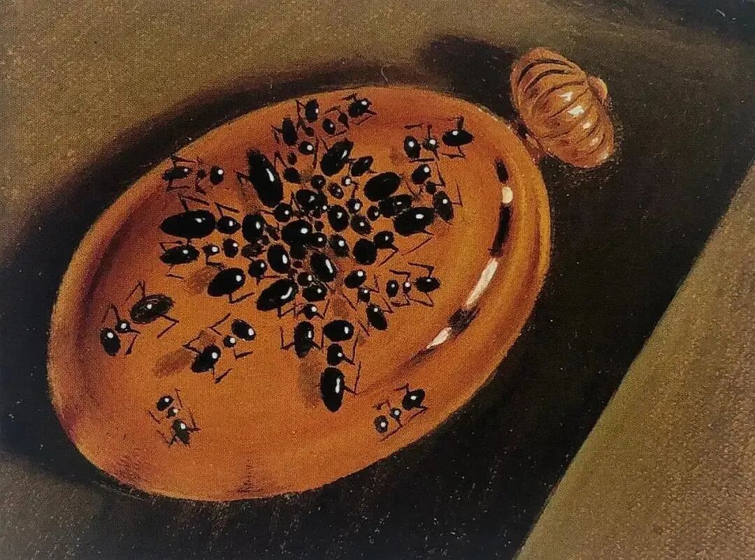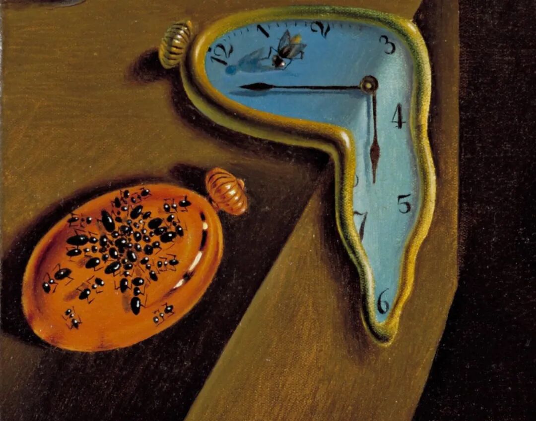 蚂蚁出现在画作中,惯常放于心脏部位的怀表,正被这群微小的生命啃食,使人略感不适,它正是人们对时间流逝深感不安的隐喻。”