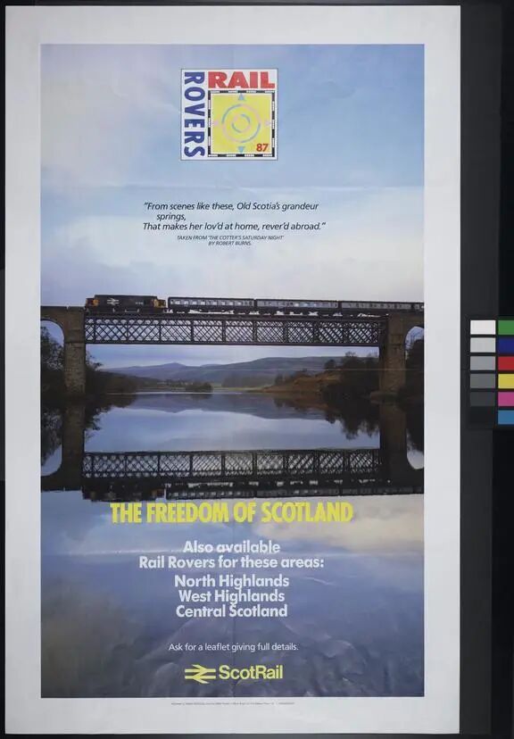 ▲ 披露后:1987 年的铁路海报,上面印有“苏格兰的自由”。海报描绘了 37 类内燃机车拖着旅客列车穿过河流的高架桥,背景是山脉。