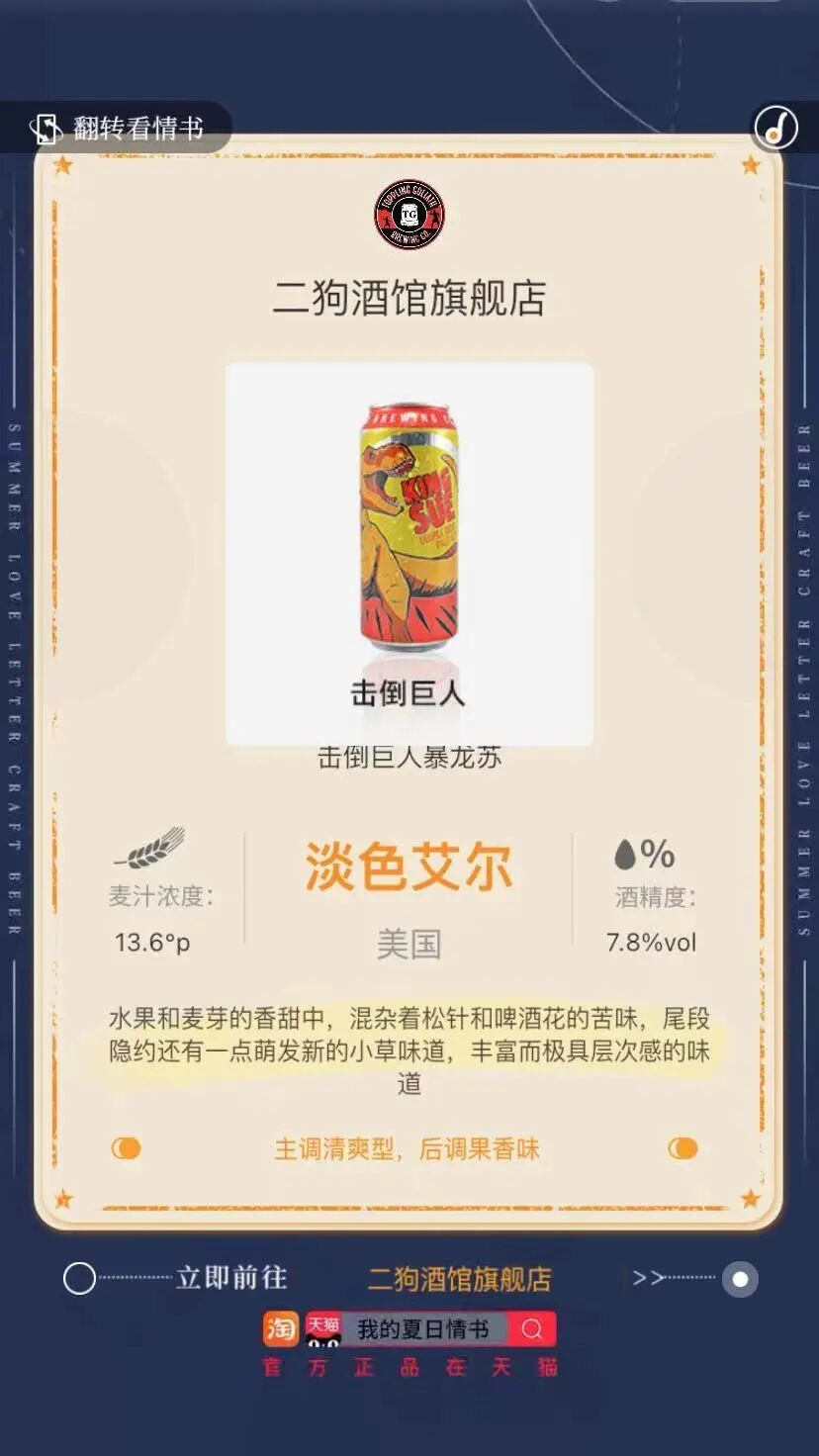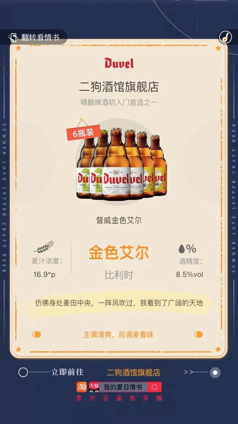 夏天的故事,总有一个是关于爱情的,夏天的结束,也会触发年轻人的情感神经。淘宝在这个夏天即将结束的阶段,将参与造物节的精酿啤酒品牌与夏日爱情的话题进行嫁接,既为品牌创造了无痕融入的契机,也使得125款精酿啤酒产品被重点突出。