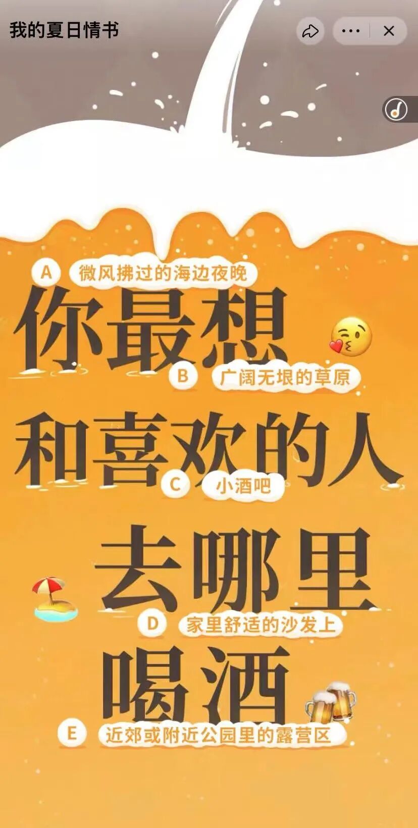 关于啤酒你偏爱什么样的口味?你最喜欢和喜欢的人去哪里喝酒?5个选项都高度契合了日常的啤酒饮用场景,或浪漫、或温馨、或惬意......,将产品与贴近大众生活的场景进行关联。