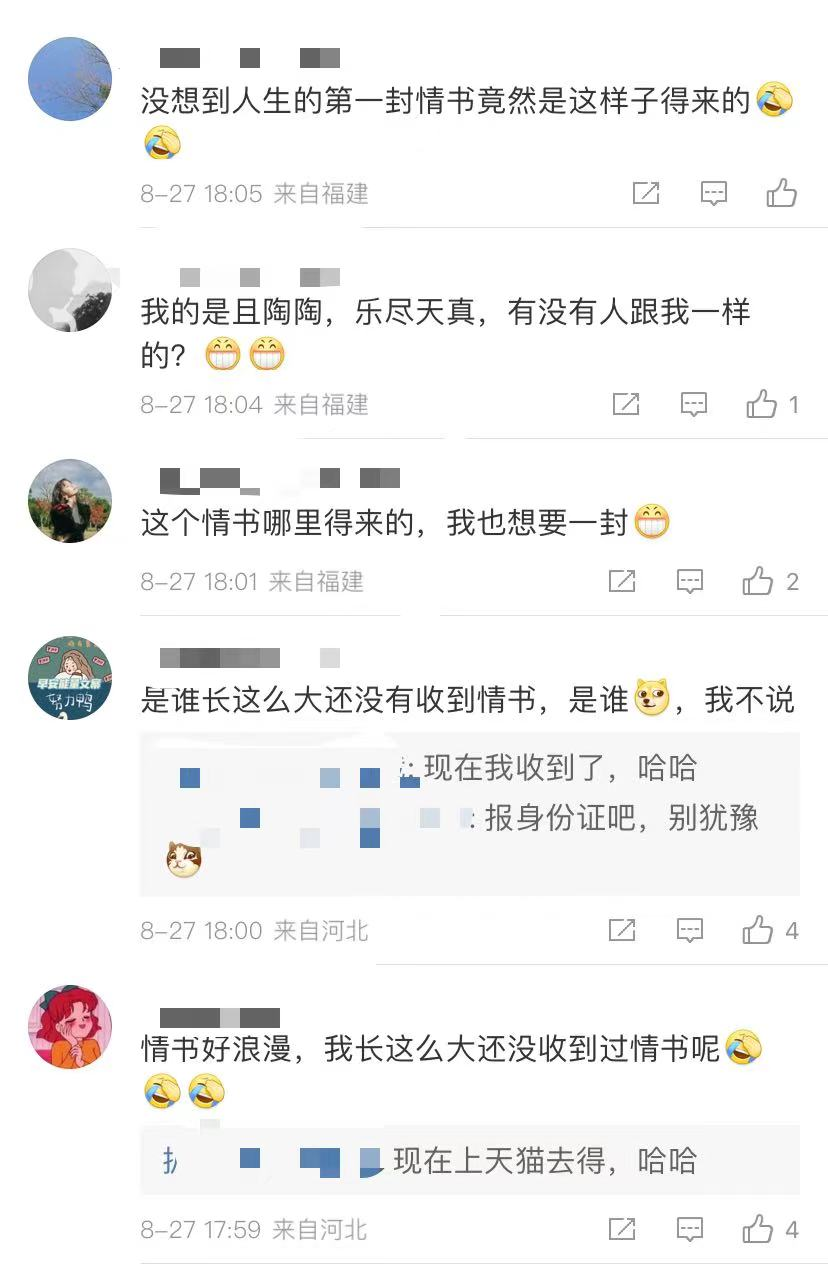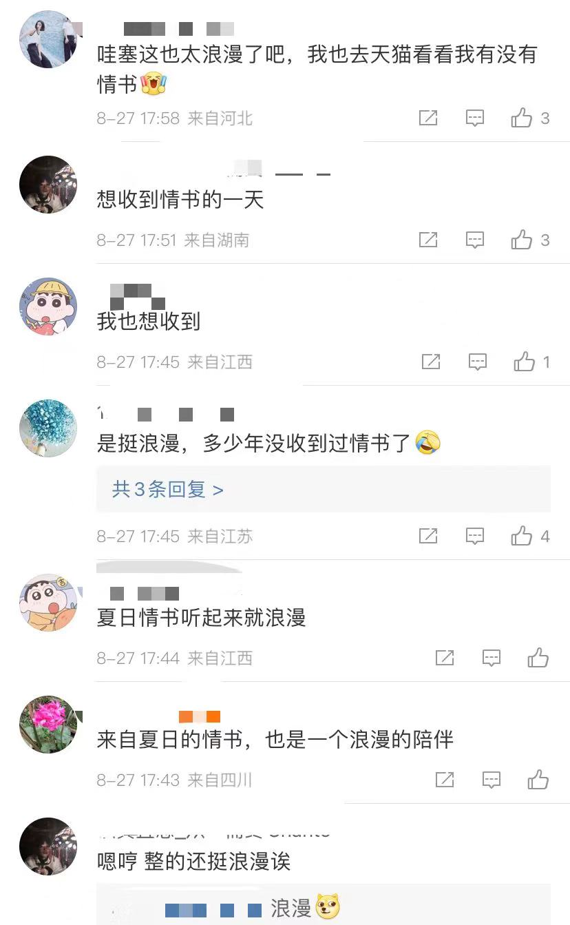 在微博上,有网友留言说,“长这么大还没收到过情书”、“情书好浪漫”,有网友收到了祝福,但却说“可惜幸运不在我身边。谢谢你,夏日情书。”