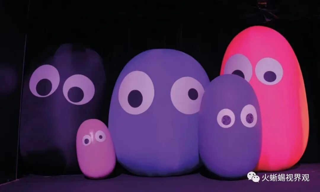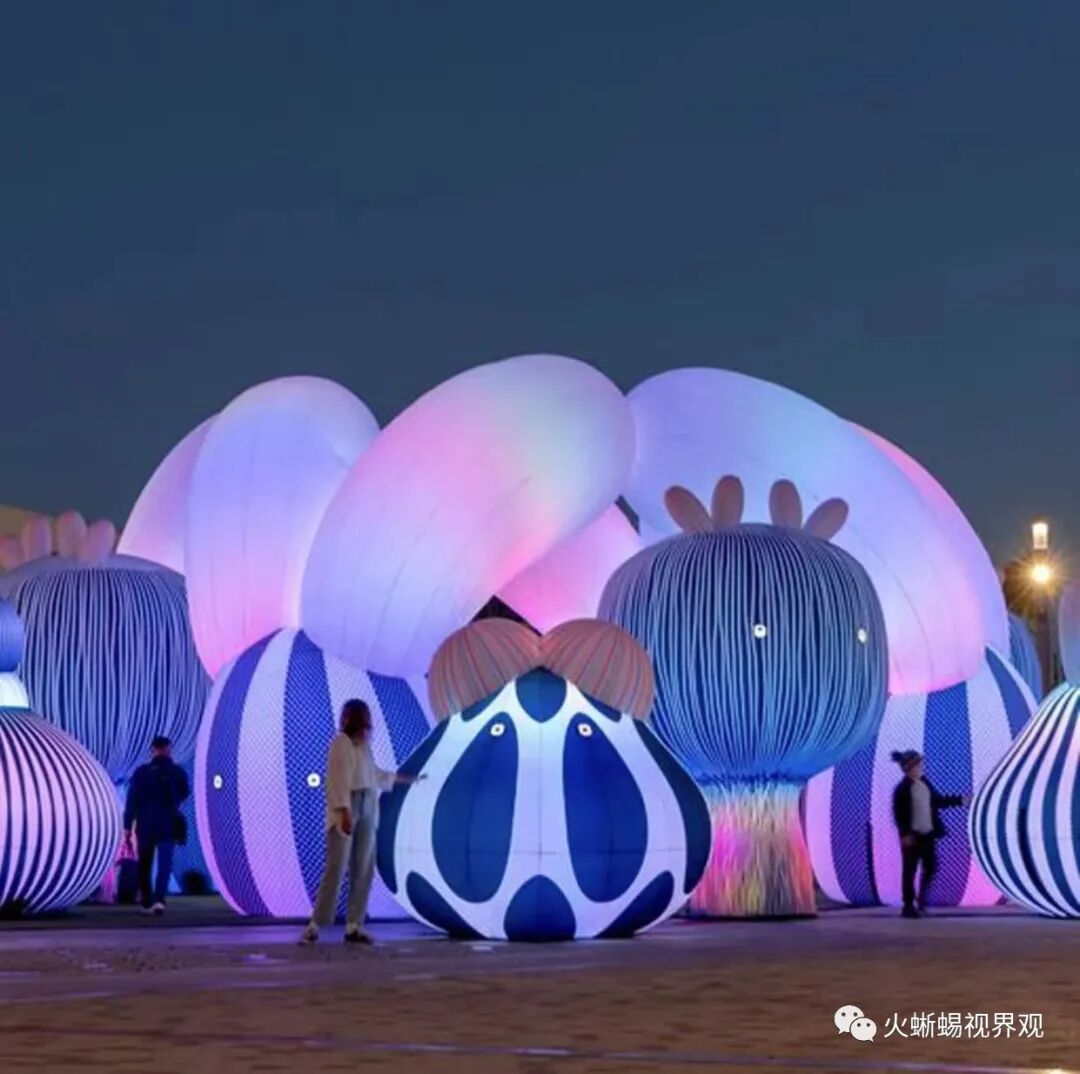 同样地,雕塑家Max Streicher通过意想不到的形式探索了尺度和空间之间的关系,他展示了“西利纳斯”,一个沉睡的巨人,巨大的尺寸向观众展示了他的脆弱。通过充气技术,他似乎在缓慢地呼吸或颤抖,就像醒来前一样。在Eness工作室的“飞艇管弦乐队”和Rub Kandy的“Ginjos”中,超大充气人物部落活跃了展览路径,高耸于游客之上,以其明亮的色调和俏皮的形式吞噬他们。游客可以在这些出乎意料的友好怪物之间漫步,同时享受互动的声光体验。