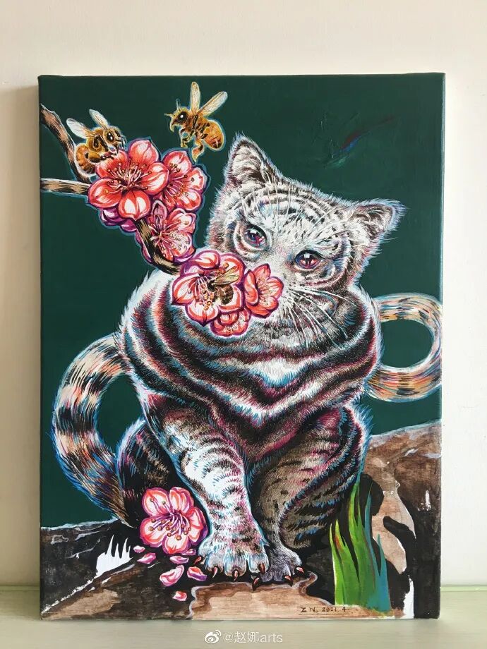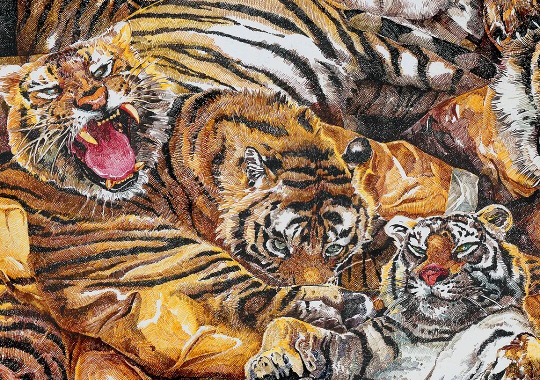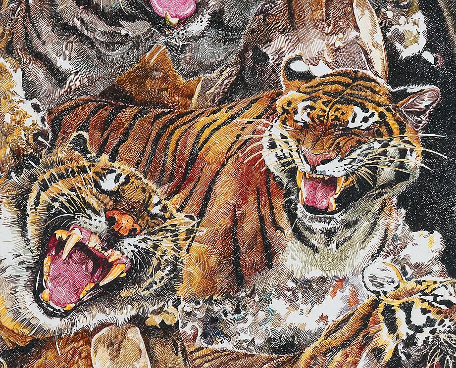 正在挣扎怒吼着的老虎正在向她咆哮,