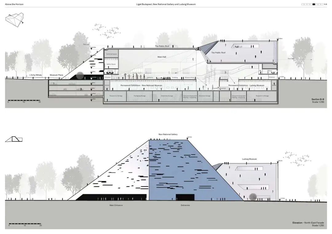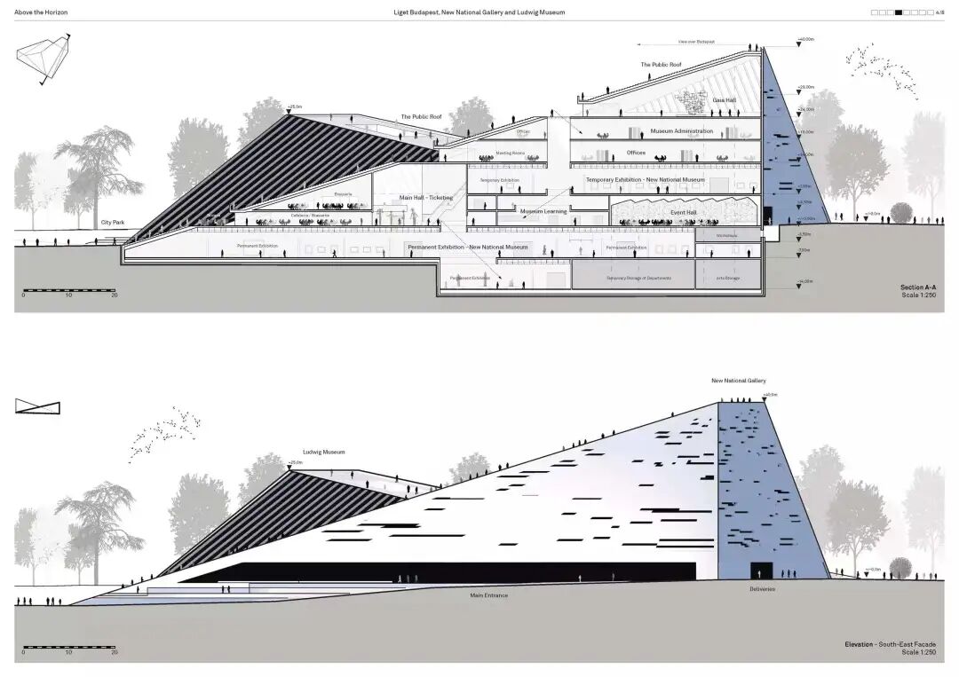 就是要一个融入周围环境的绿色可持续建筑,还要在展览空间之外为游客创造出一定的室外公共空间,归还原来占了公园的地,等于就是花一份钱办两份事。那倒也情有可原,布达佩斯这次一口气在这块地上规划了5个文化建筑,可不得精打细算!