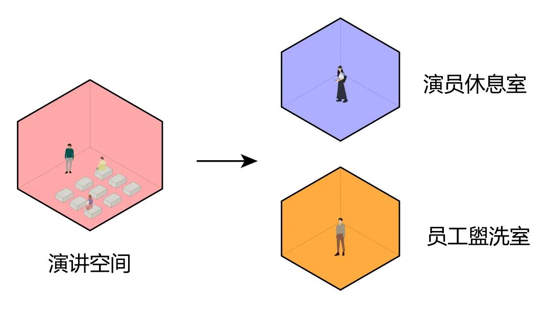 任务书中指出还需要设计一些演讲空间以供举行一些表演活动和公共课程,这就产生了更多的服务型空间需求,比如演员休息室与员工盥洗室。