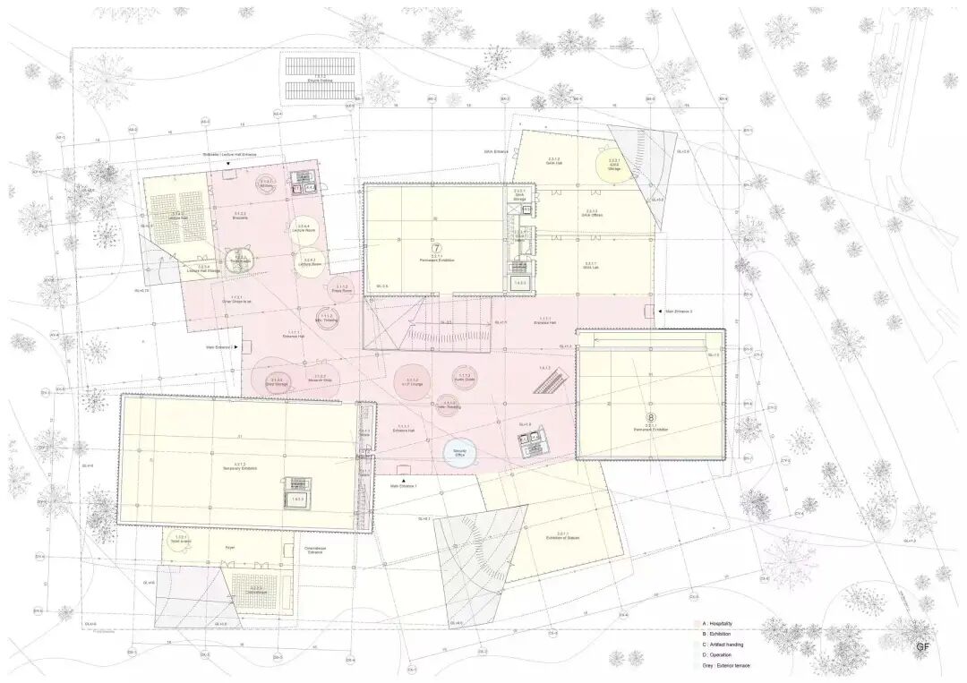 我们还是先从GF开始。每层的室内空间也只保留最基本的展览空间和结构,根据展品需要调整每个展览空间体块的高度,周围公共空间的层高则自由地适应不同的展厅高度。