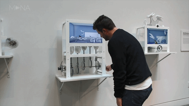 该作品结合了雕塑,电子和软件,将无生命的物体和空间融入生活。通过用技术对物体进行去语境化,反之亦然,可以用新的方式看待这件作品的组成部分。以这件作品为媒介,探索了荒诞、幽默、徒劳和超现实主题。