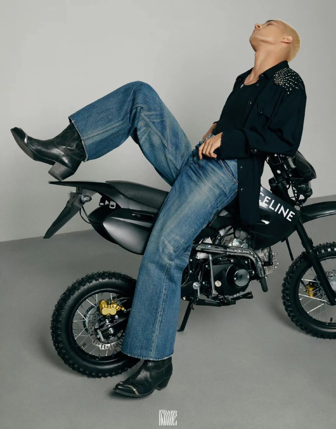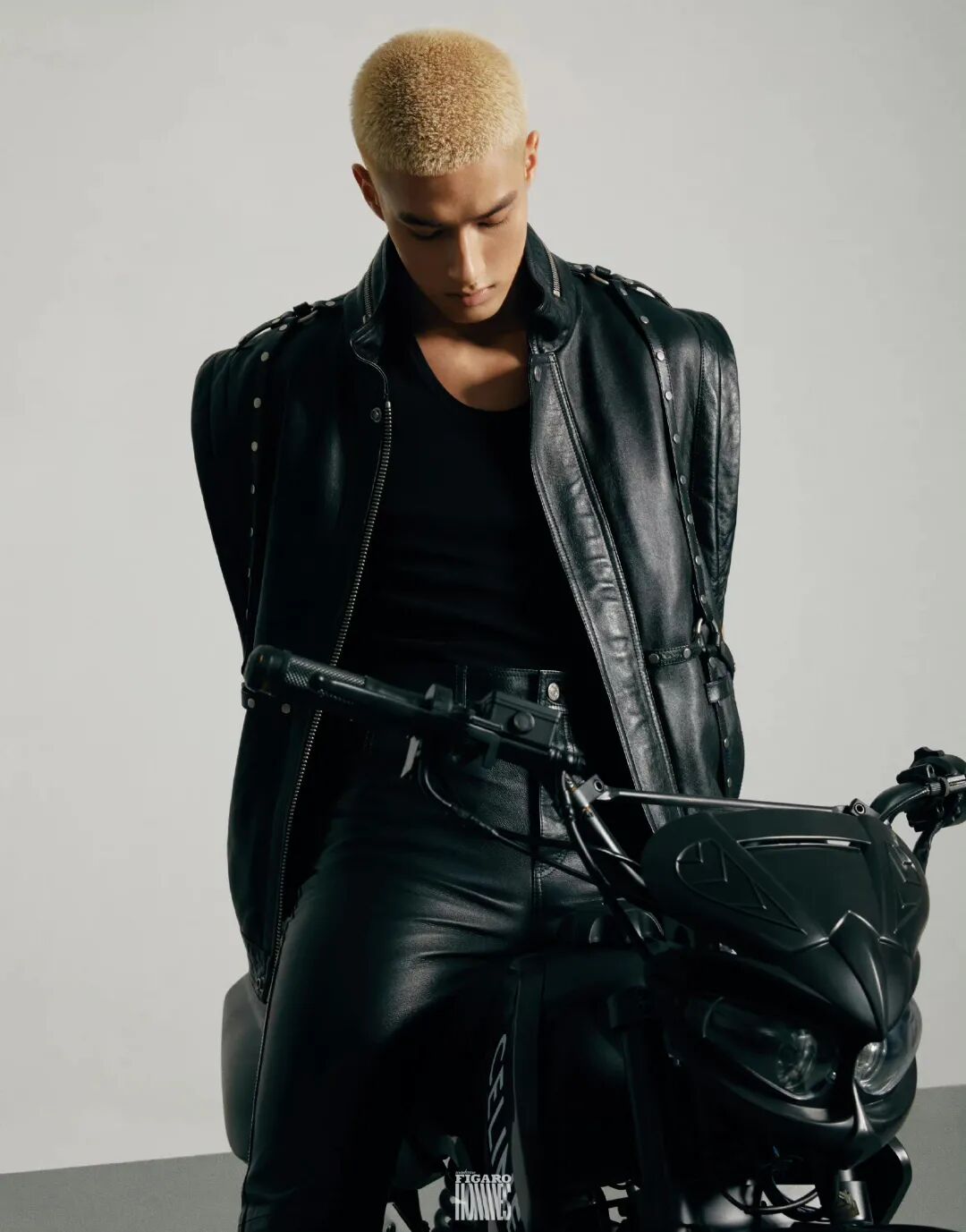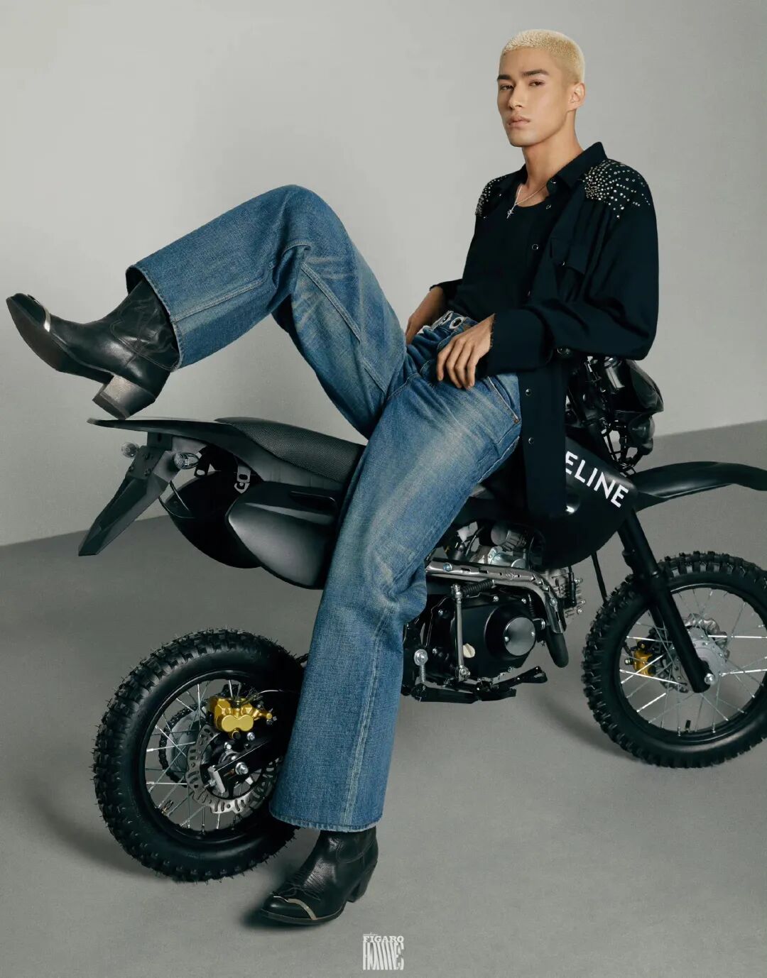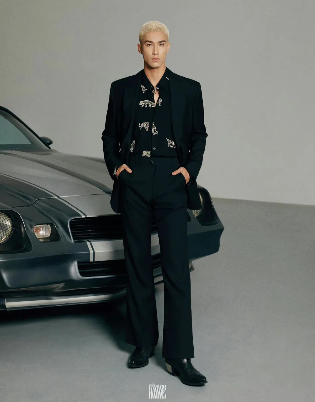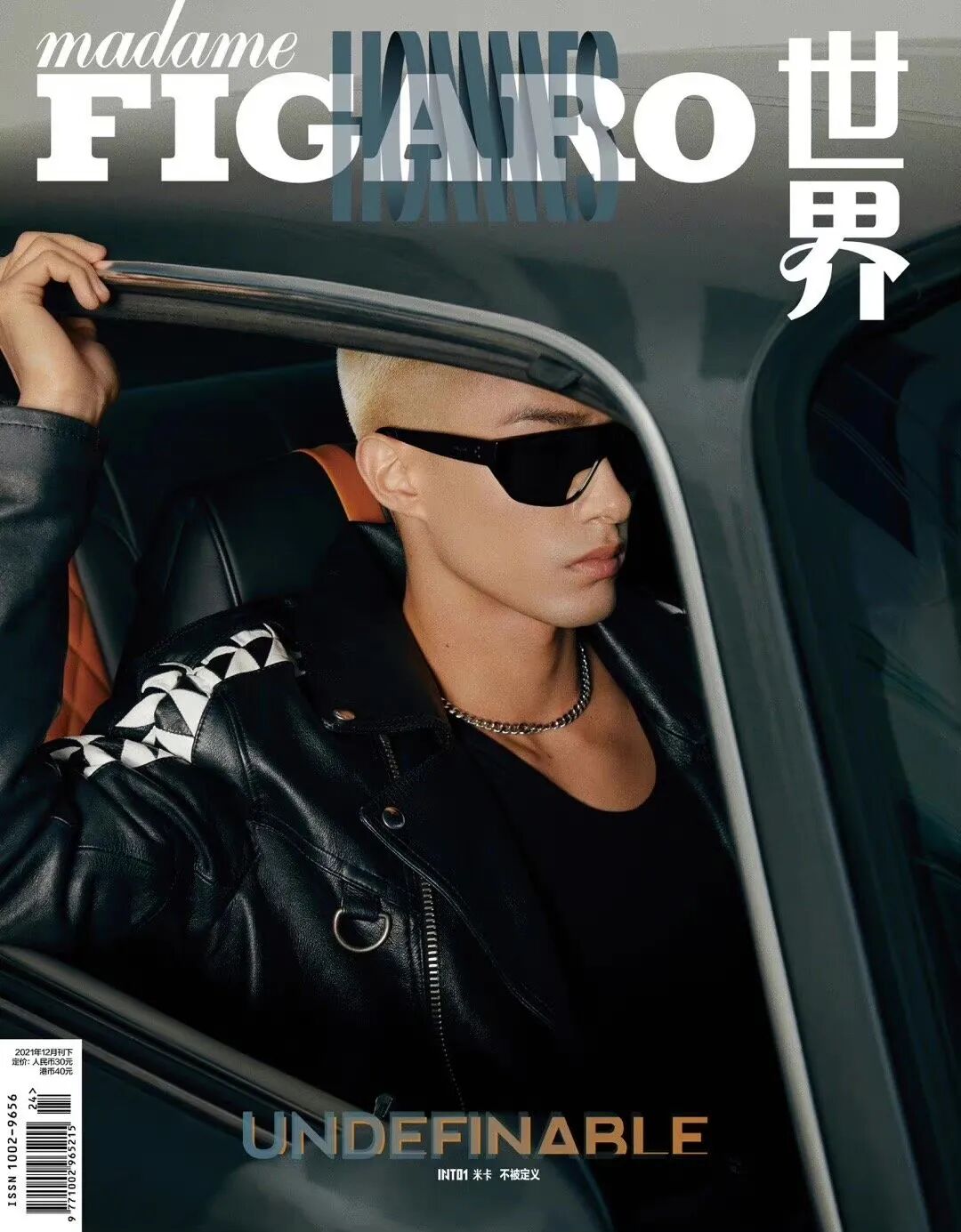 INTO1米卡身着 CELINE 登上《Madame Figaro Hommes》十二月刊双封面,金发寸头搭配酷帅穿搭超拉风,你要选择坐上他的摩托车还是古董车上?