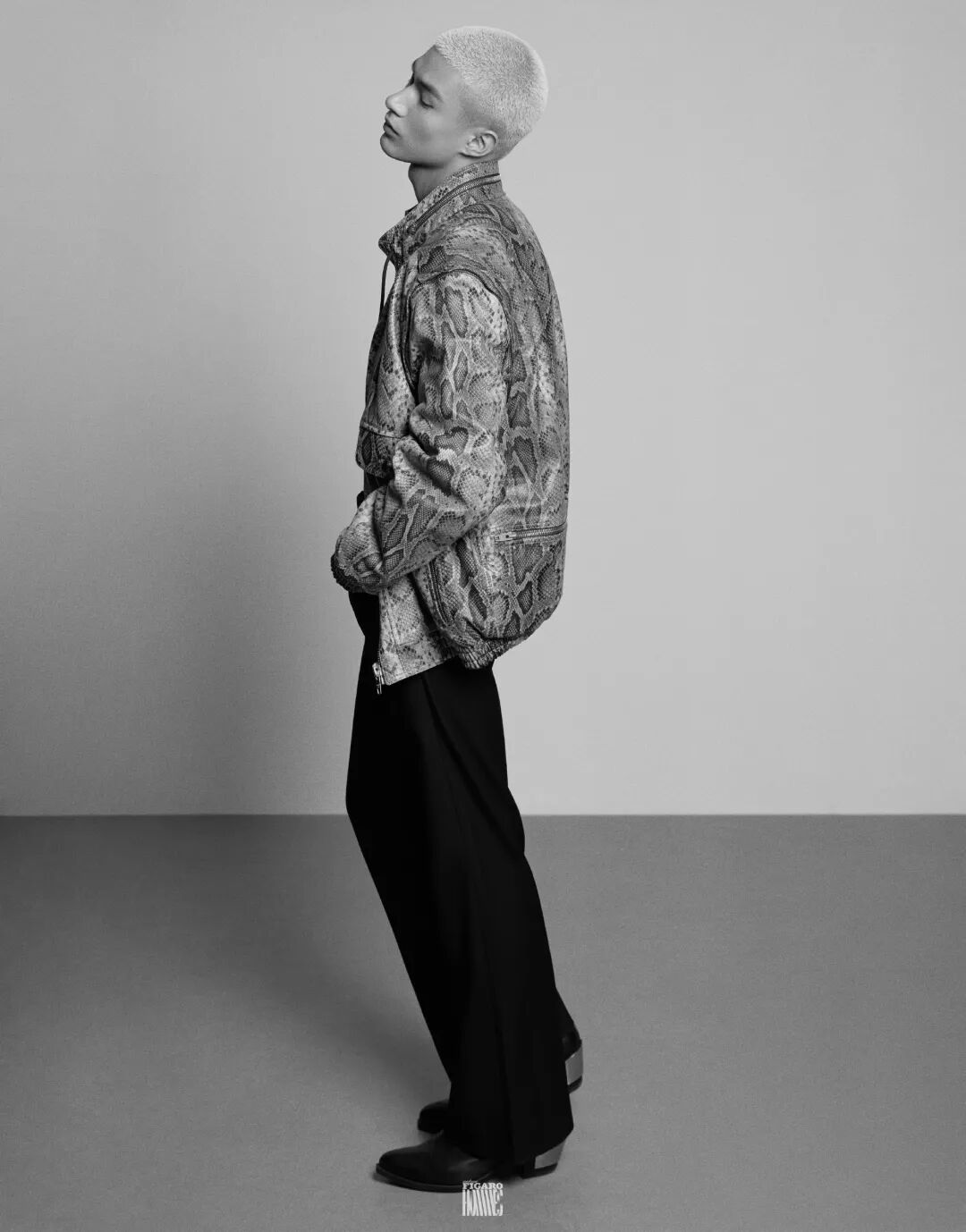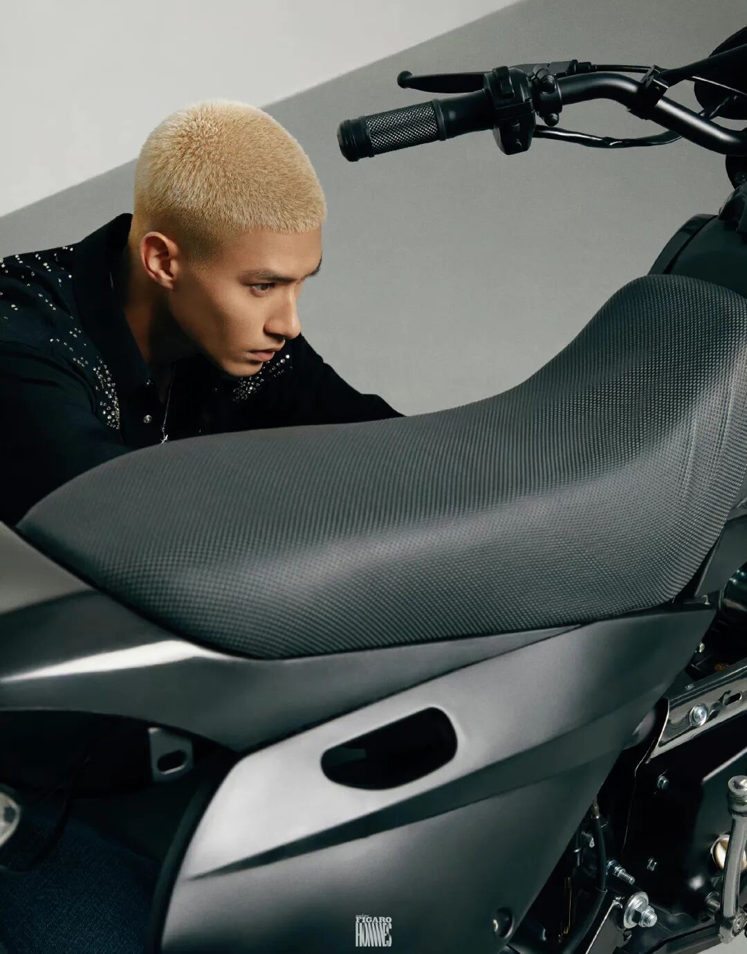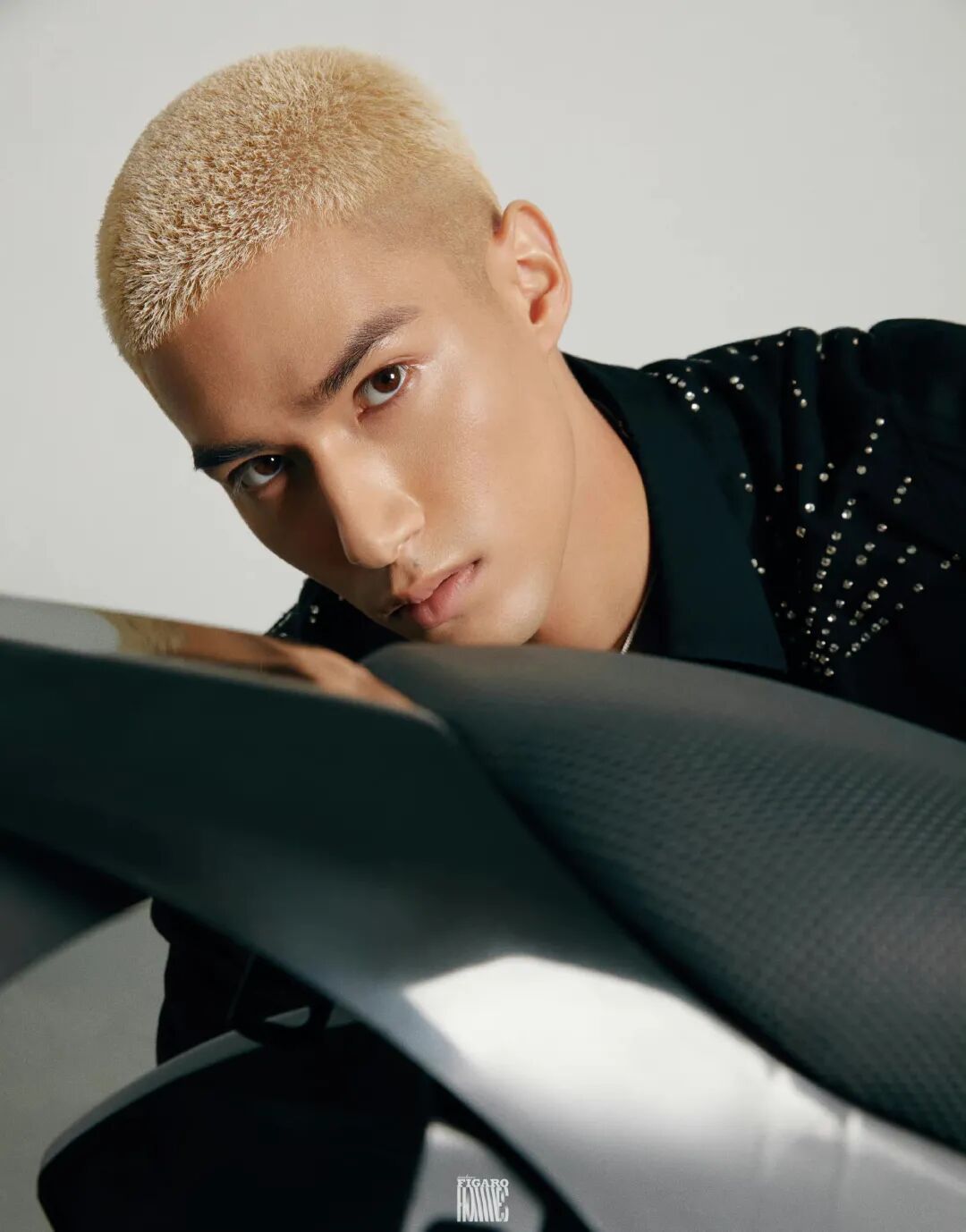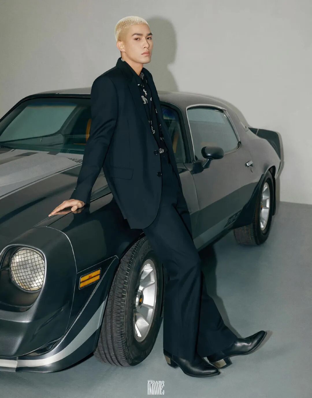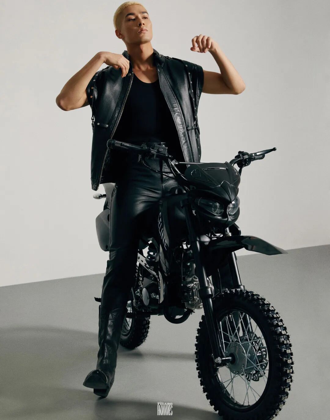 INTO1米卡身着 CELINE 登上《Madame Figaro Hommes》十二月刊双封面,金发寸头搭配酷帅穿搭超拉风,你要选择坐上他的摩托车还是古董车上?