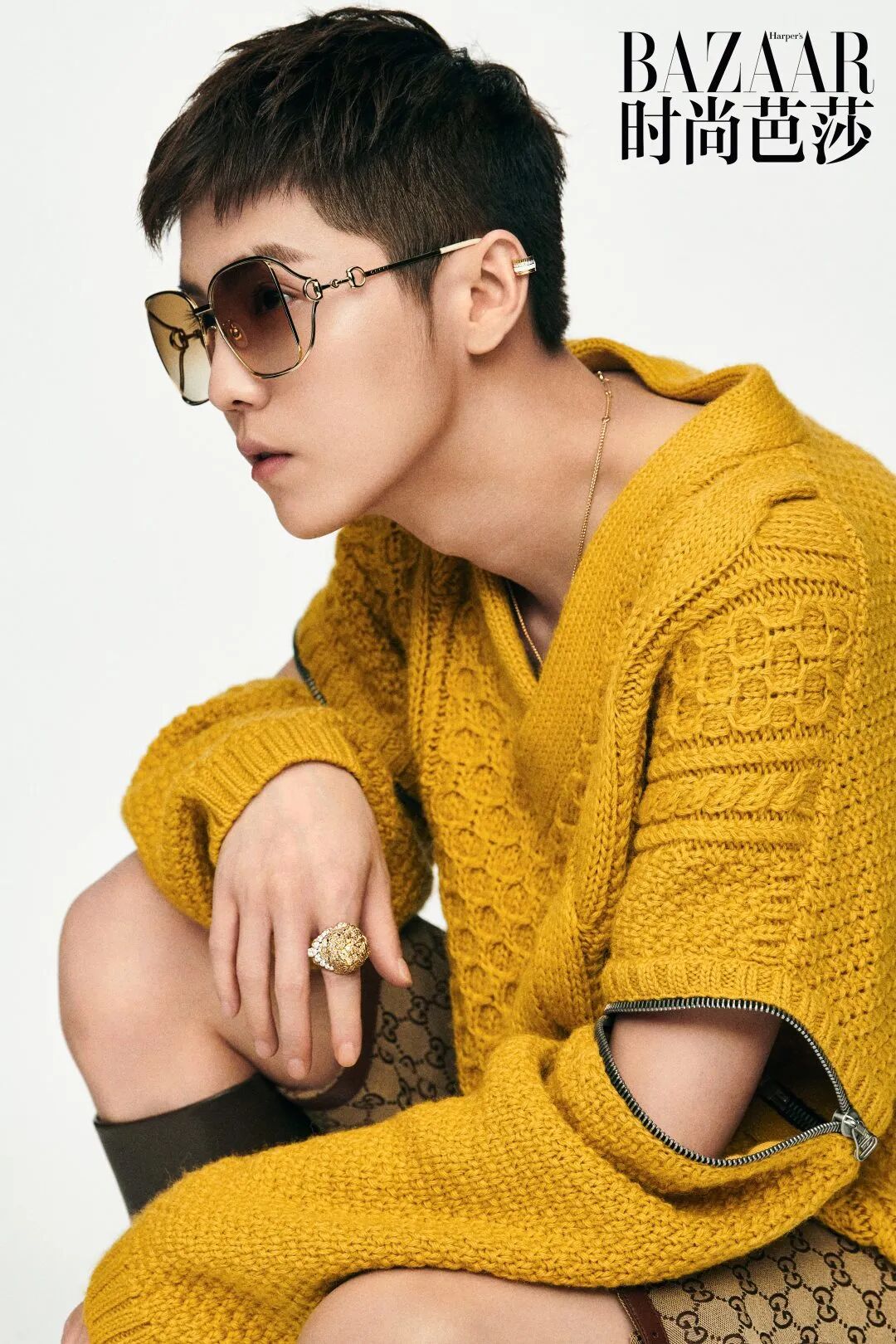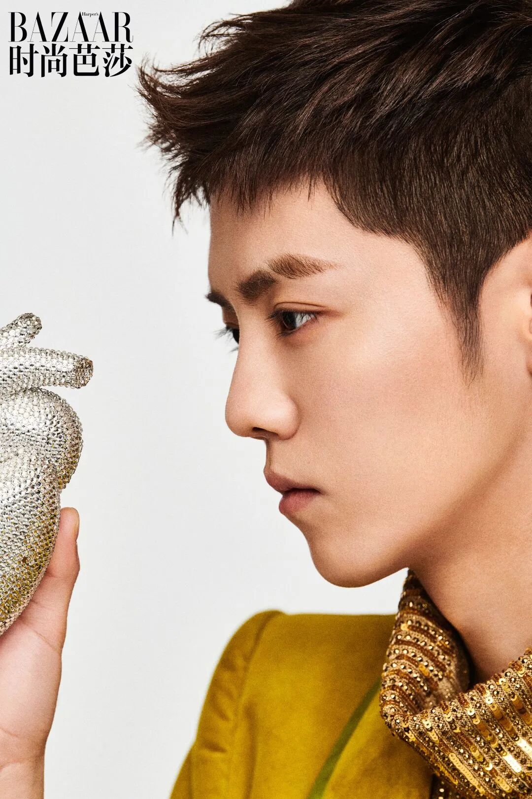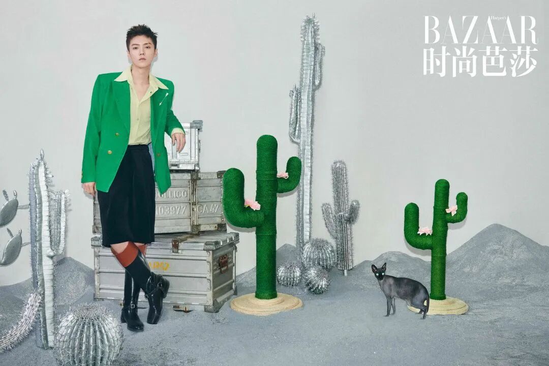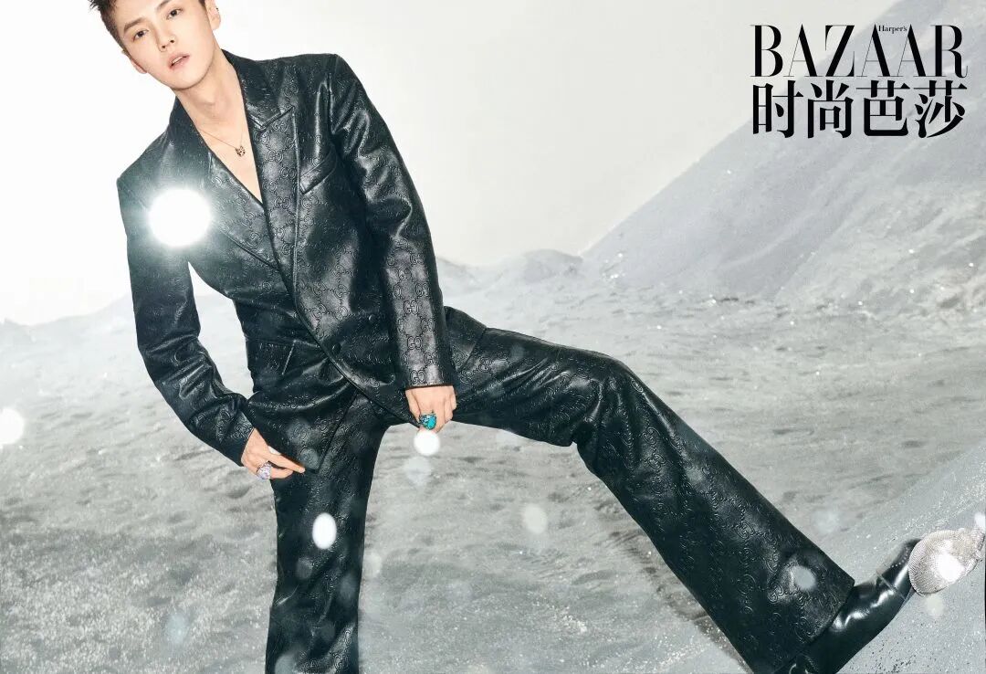 《时尚芭莎》另一位封面人物是鹿晗,他身着一系列 GUCCI 服装,以短发断眉造型拍摄怼脸照,记录下帅气的一面,大家可以顺便来跟鹿老师学色彩穿搭了!